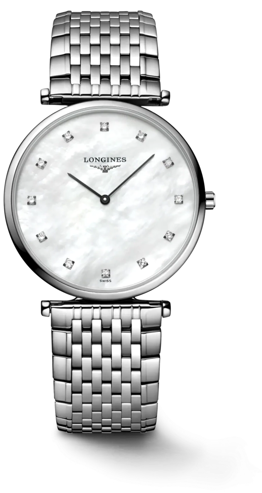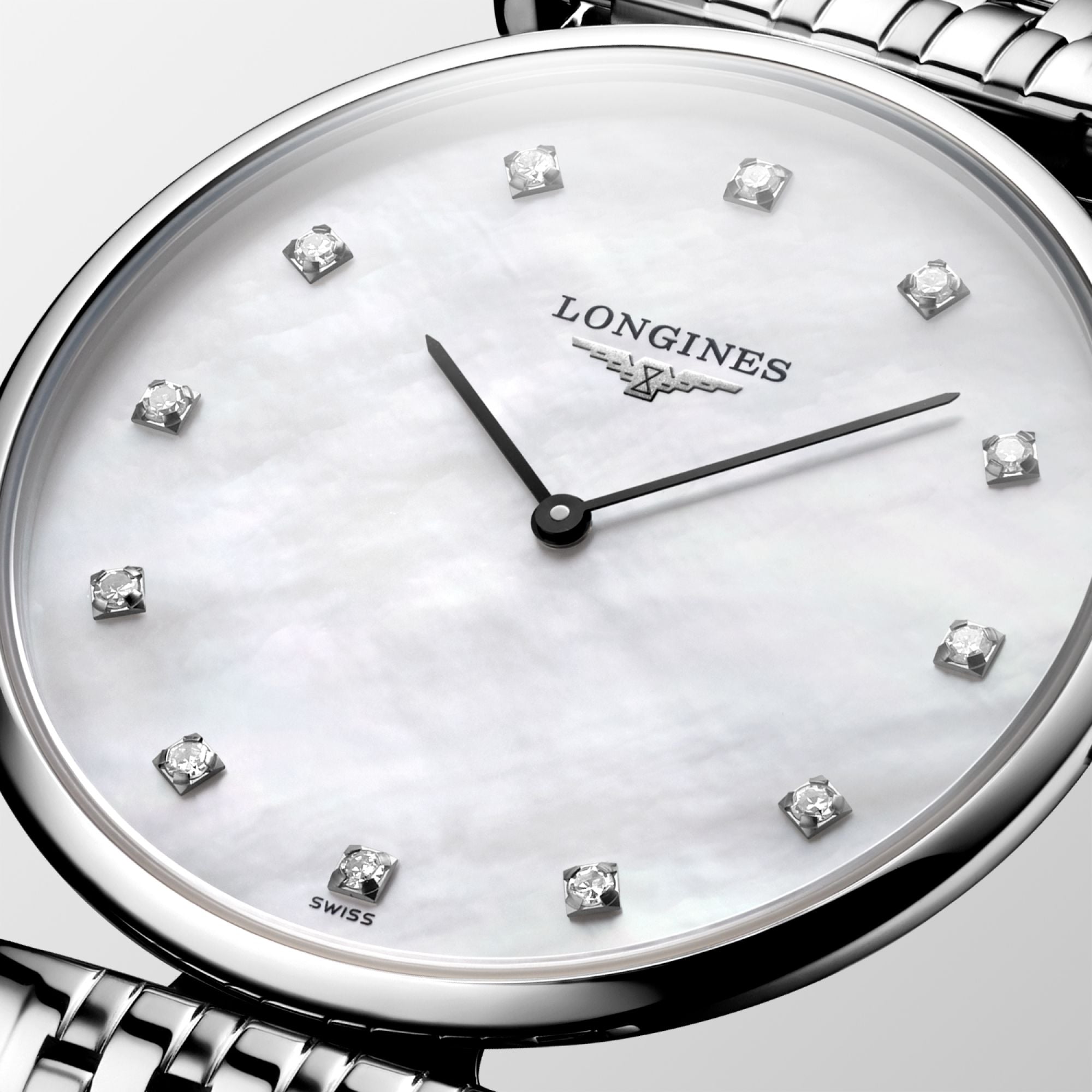 This Longines La Grande Classique de Longines Ladies watch instantly captures attention with its graceful white mother of pearl face, sleek black hands and dazzling 12 Top Wesselton diamond indices. Protecting the centrepiece dial is scratch resistant sapphire crystal glass treated with an anti-reflective coating for easy legibility. The remarkably slim case measures to 33mm in diameter and is crafted from polished stainless steel to pair with the matching stainless steel fine link bracelet with a triple safety folding clasp and push-piece opening mechanism. Embraced within is the classic L420 quartz movement, a Swiss made calibre which promises only the best in precision and the performance of the classic hands for hours and minutes.