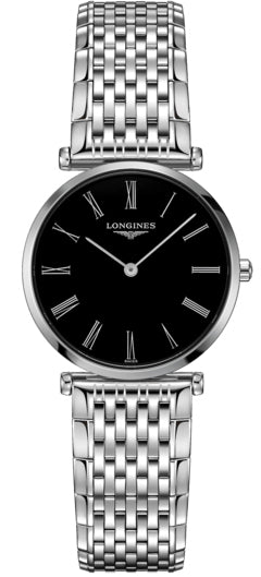 Crafted from elegantly polished stainless steel, the 29mm case of this Longines La Grande Classique de Longines Mens watch is home to a Swiss made quartz movement. The L420 calibre maintains almost perfect precision and provides classic central hands for hours and minutes. The movement is kept hidden behind a 30 metre water resistant case back and beneath a stunning black sunray dial decorated with silvered polished hands and traditional Roman numerals. Protected by scratch resistant sapphire crystal glass, the black dial and famous hourglass logo pair perfectly with fine link stainless steel bracelet and triple safety folding buckle with push piece opening mechanism.