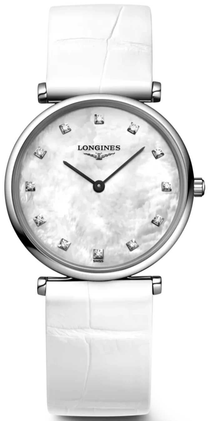 This Longines La Grande Classique de Longines Ladies watch instantly captures attention with its graceful white mother of pearl dial, sleek silvered polished hands and 12 Top Wesselton diamond dot indices. Protecting the centrepiece dial is scratch resistant sapphire crystal glass treated with an anti-reflective coating for easy legibility. The remarkably slim case measures to 29mm in diameter and is crafted from polished stainless steel to pair with the shiny white alligator leather strap. Embraced within is the classic L420 quartz movement, a Swiss made calibre which promises only the best in precision and the performance of the classic hands for hours and minutes.