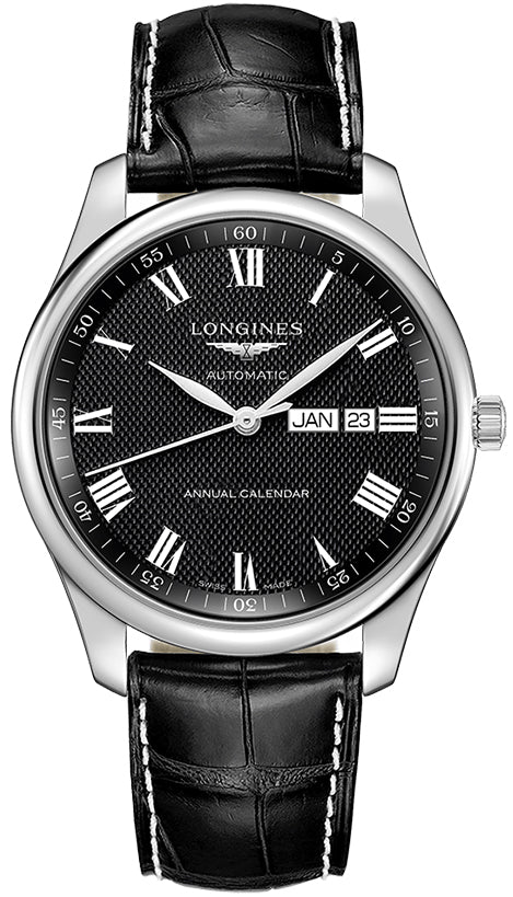 The polished stainless steel case of this Longines Master Collection watch measures to a neat 42mm in size and is fastened effortlessly to the wrist by a comfortable black alligator leather strap and a stainless steel triple security folding clasp. The L897 automatic winding movement delivers exceptional functionality, providing the men’s dress watch with hour, minutes, seconds function, a double day and date window at 3 o’clock and an impressive power reserve of 64 hours. The unique black “barley corn dial is the perfect backdrop to these functions, decorated in painted Roman numerals, silvered polished hands and the legendary winged hourglass logo.