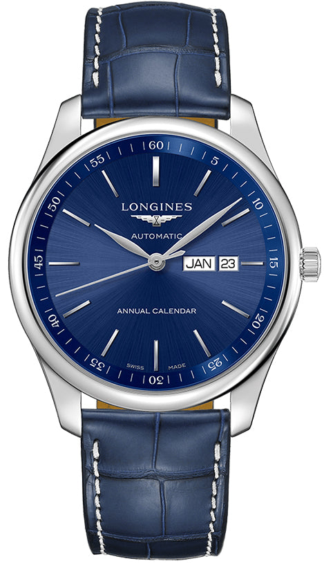 The polished stainless steel case of this Longines Master Collection watch measures to a neat 42mm in size and is fastened effortlessly to the wrist by a comfortable blue alligator leather strap and stainless steel triple security folding clasp. The L897 automatic winding movement delivers exceptional functionality, providing the men’s dress watch with hour, minutes, seconds function, a double day and date window at 3 o’clock and an impressive power reserve of 64 hours. The handsome blue sunray dial is the perfect backdrop to these functions, decorated in applied indexes, silvered polished hands and the legendary winged hourglass logo.