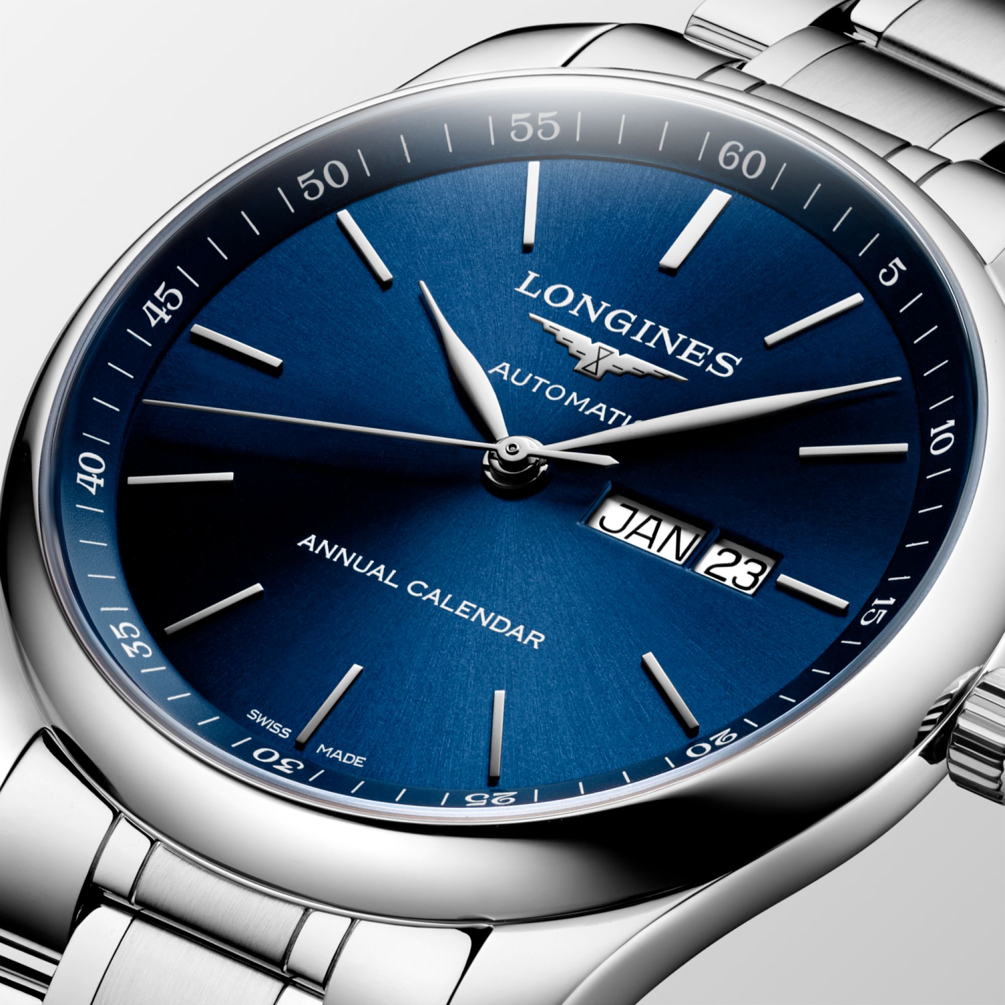 The polished stainless steel case of this Longines Master Collection watch measures to a neat 42mm in size and is fastened effortlessly to the wrist by a comfortable three-row bracelet with two-toned brushed and polished finishing and a triple security folding clasp. The L897 automatic winding movement delivers exceptional functionality, providing the men’s dress watch with hour, minutes, seconds function, a double day and date window at 3 o’clock and an impressive power reserve of 64 hours. The handsome blue sunray dial is the perfect backdrop to these functions, decorated in applied indexes, silvered polished hands and the legendary winged hourglass logo.