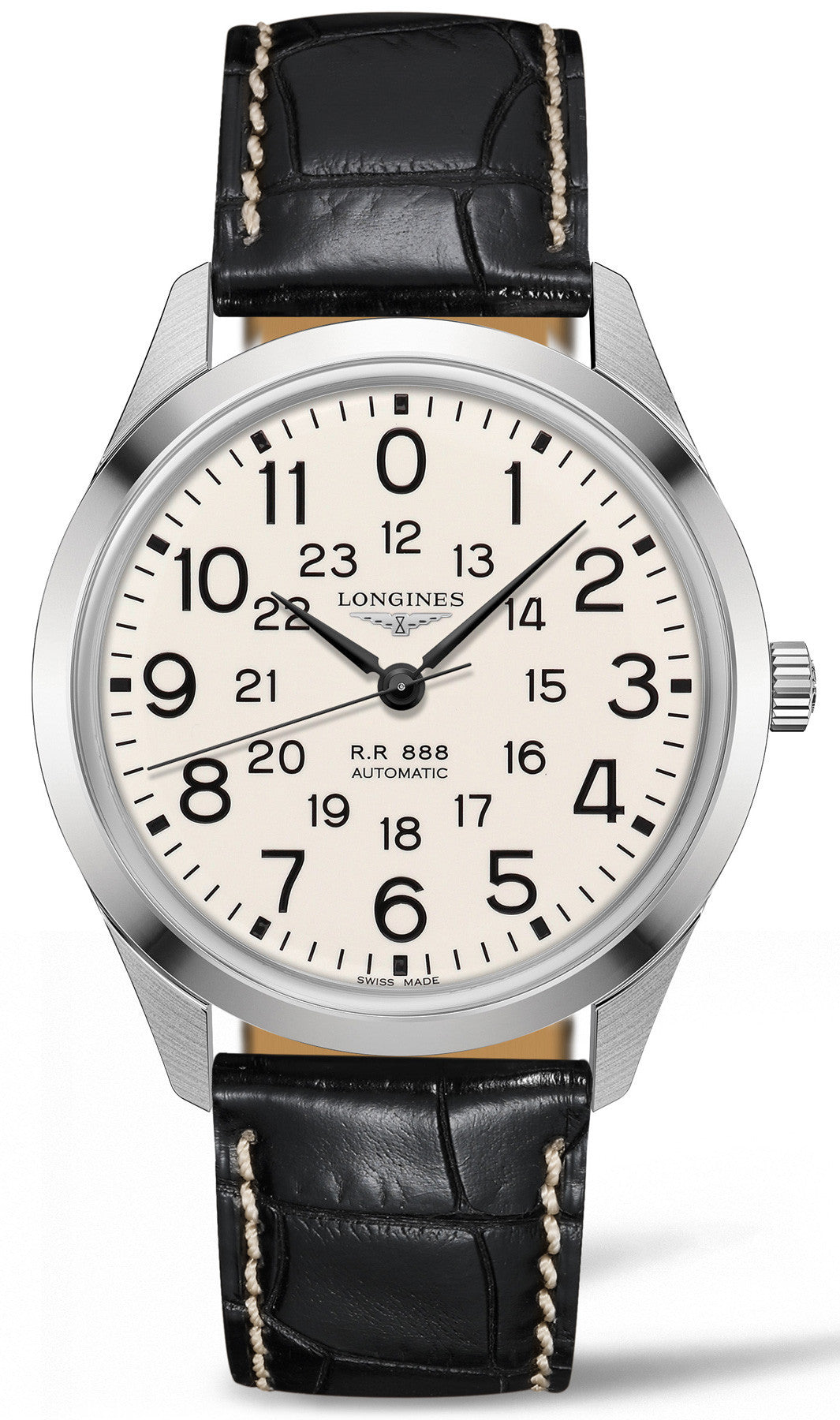 This Longines Railroad watch boasts an automatic winding mechanical movement that is kept hidden within the stainless steel case while the case back is beautifully engraved with the original decoration that was found on the pocket watches used by railroad companies in the 1920s. Housed beneath the scratch resistant glass is a crisp white polished dial adorned with black painted Arabic numerals and shiny lacquer black hands. To complete the look, a black alligator strap and stainless steel pin buckle is added for a luxurious finish.