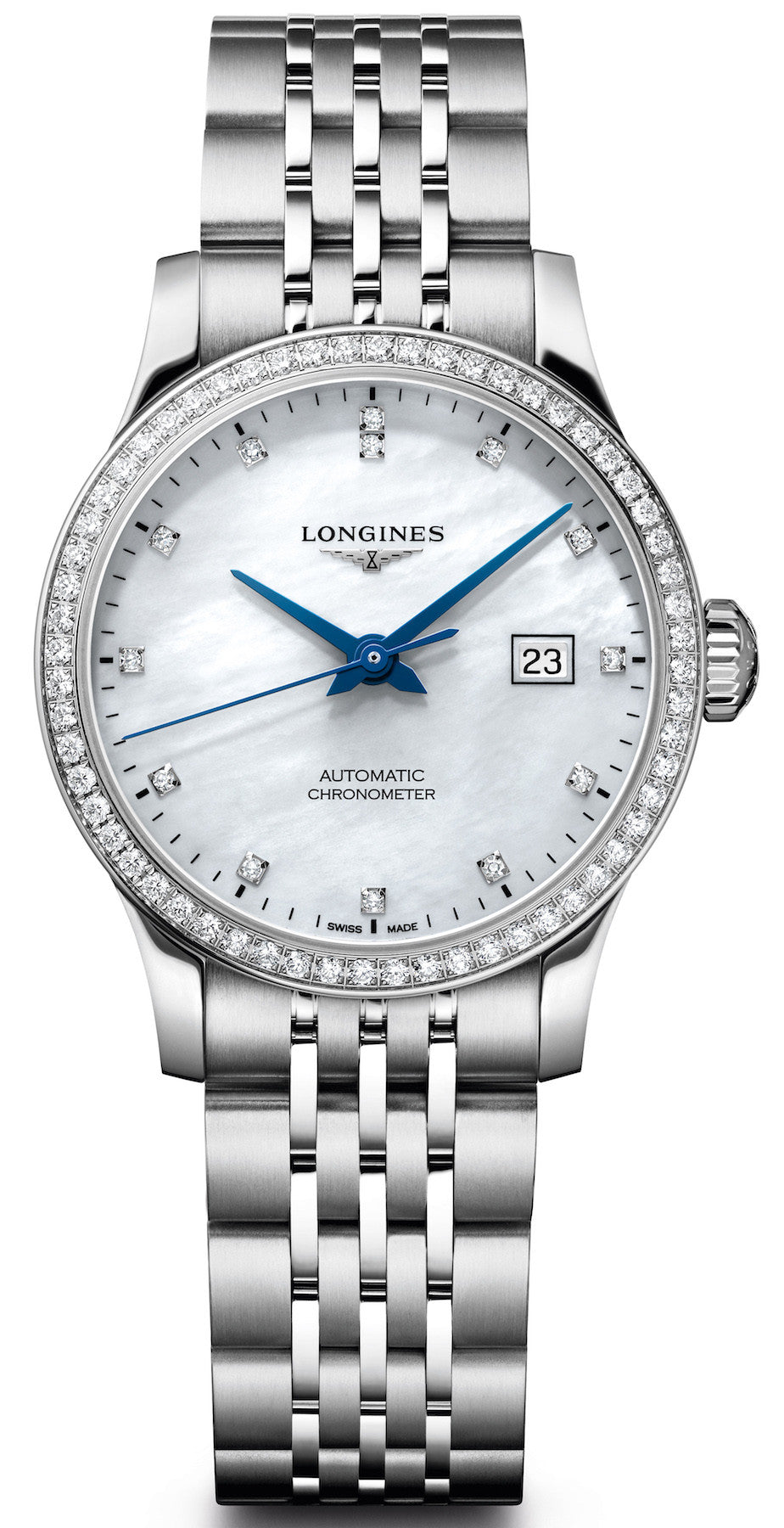 At the time of its release, the Longines Record watch collection was the first by the Swiss watch manufacturer to embrace a chronometer certified calibre and still today, this Longines Record Ladies watch eclipses all else around it. It’s remarkable accuracy of -4 and +6 seconds per day has been certified by the Official Chronometer Testing Institute, or COSC for short, and boasts reliability and precision unrivalled by any other luxury ladies watch on the market. The Swiss made L592.4 mechanical calibre is equipped with a monocrystalline silicon balance spring, providing the movement with a unique set of properties including a high rate of accuracy, a frequency of 28,800vph and an impressive power reserve of 40 hours.