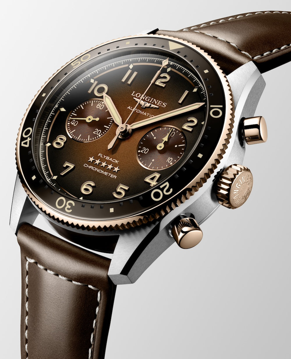 Longines Watch Spirit Flyback L3.821.5.59.2. The Longines Spirit Flyback is a 42 mm-diameter, with flyback function, shaded matt brown dial, features a cap, crown and pushers in 18-carat rose gold, water-resistant up to 10 bar (100 metres) and powered by the exclusive Longines chronometer-certified by the COSC with a power reserve of up to 68 hours.