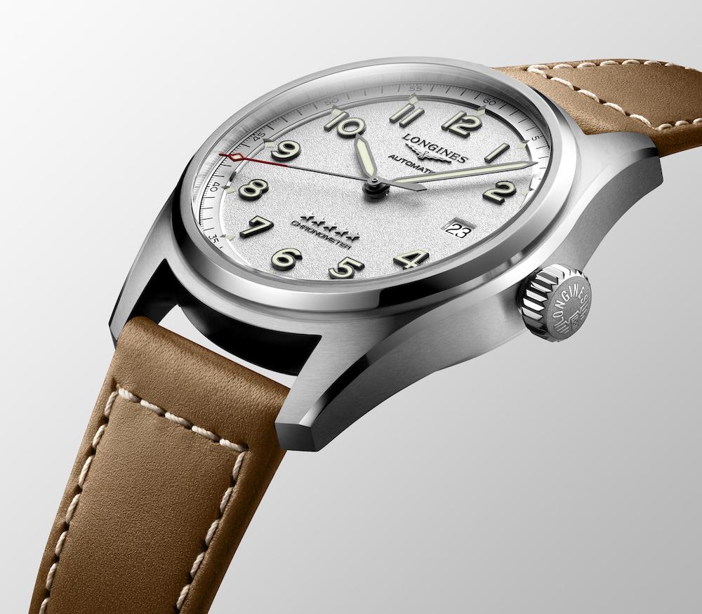 Powered by the L888.4 automatic winding chronometer certified movement, this Longines Spirit Mens watch ensures reliability, durability and precision at its finest. Alongside a healthy 64 hour power reserve, the Swiss watch movement delivers a frequency of 25,200 vibrations per hour and comes equipped with the brand’s illustrious silicon balance spring to ensure outstanding quality and the constant precision of time. Its silicon construction makes it lighter and more durable than a traditional balance spring – just as the flight of an aircraft depends on the fine balance of its wings. Its exterior is composed of classic stainless steel, measuring to 40mm in diameter and is fitted with anti-reflective sapphire crystal glass and a screw in crown to assist in its water resistant rating of 100 metres. At it’s centre, a handsome silver dial is detailed with luminous Arabic numerals, black hands and a date aperture and to secure it firmly to the wrist, a brown calfskin leather strap is added with a classic stainless steel pin buckle.