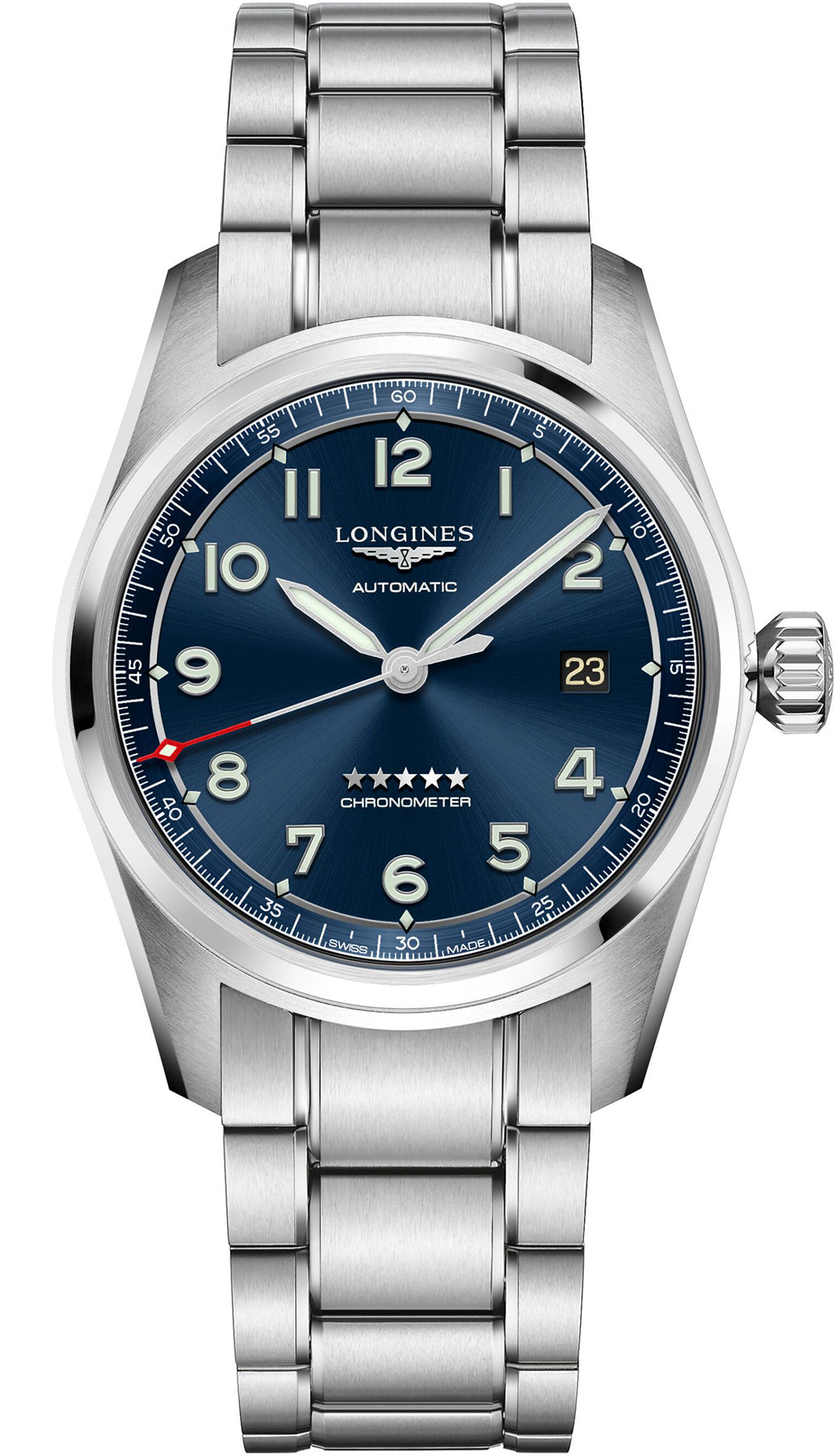 Powered by the L888.4 automatic winding chronometer certified movement, this Longines Spirit Mens watch ensures reliability, durability and precision at its finest. Alongside a healthy 64 hour power reserve, the Swiss watch movement delivers a frequency of 25,200 vibrations per hour and comes equipped with the brand’s illustrious silicon balance spring to ensure outstanding quality and the constant precision of time. Its silicon construction makes it lighter and more durable than a traditional balance spring – just as the flight of an aircraft depends on the fine balance of its wings. Its exterior is composed of classic stainless steel, measuring to 40mm in diameter and is fitted with anti-reflective sapphire crystal glass and a screw in crown to assist in its water resistant rating of 100 metres. At it’s centre, a handsome sunray blue dial is detailed with luminous Arabic numerals, silver sandblasted hands and a date aperture and to secure it firmly to the wrist, a stainless steel bracelet is added with a triple safety folding clasp with push-piece opening mechanism.