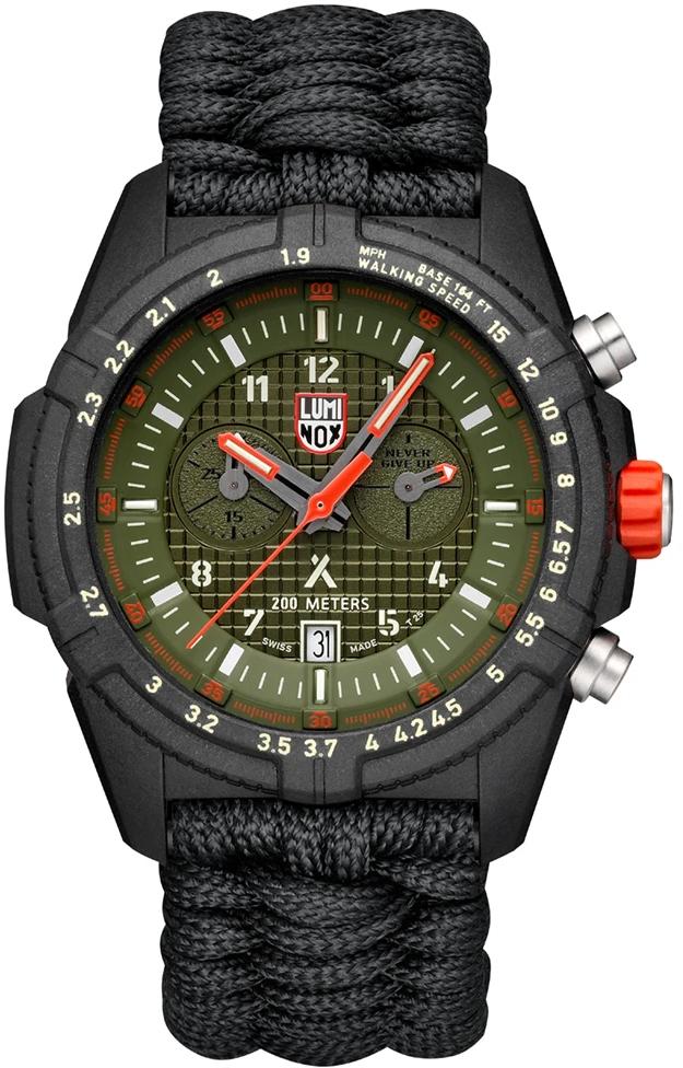 Luminox Watch Land Series Bear Grylls Survival 3798.MI. The Bear Grylls 3798.MI watch features Bear Grylls logo and motto, Never Give Up, on the dial and the case back. The tactical watch incorporates a chronograph function, paracord strap, walking speed scale, and, of course, Luminox Light Technology so that the watch is visible in any lighting conditions and will remain so for up to 25 years.