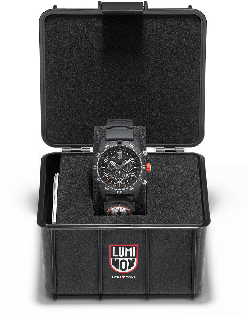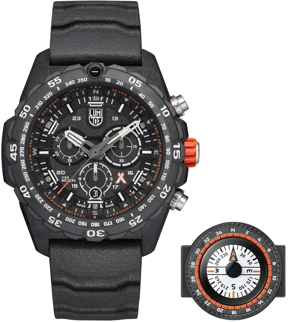 Luminox Watch Master Series Bear Grylls Survival XB.3741. The MASTER Series features two chronographs in 45mm CARBONOX cases with orange details on the case, including SOS in Morse code for quick reference. The pushers of the chronograph are in solid stainless steel, while the stainless steel crown has an orange rubber crown ring for easy grip. This special timepiece is water resistant to 300 meters and has a sapphire crystal with anti reflective coating. It comes on a black rubber strap and fitted with a compass already assembled to the strap.