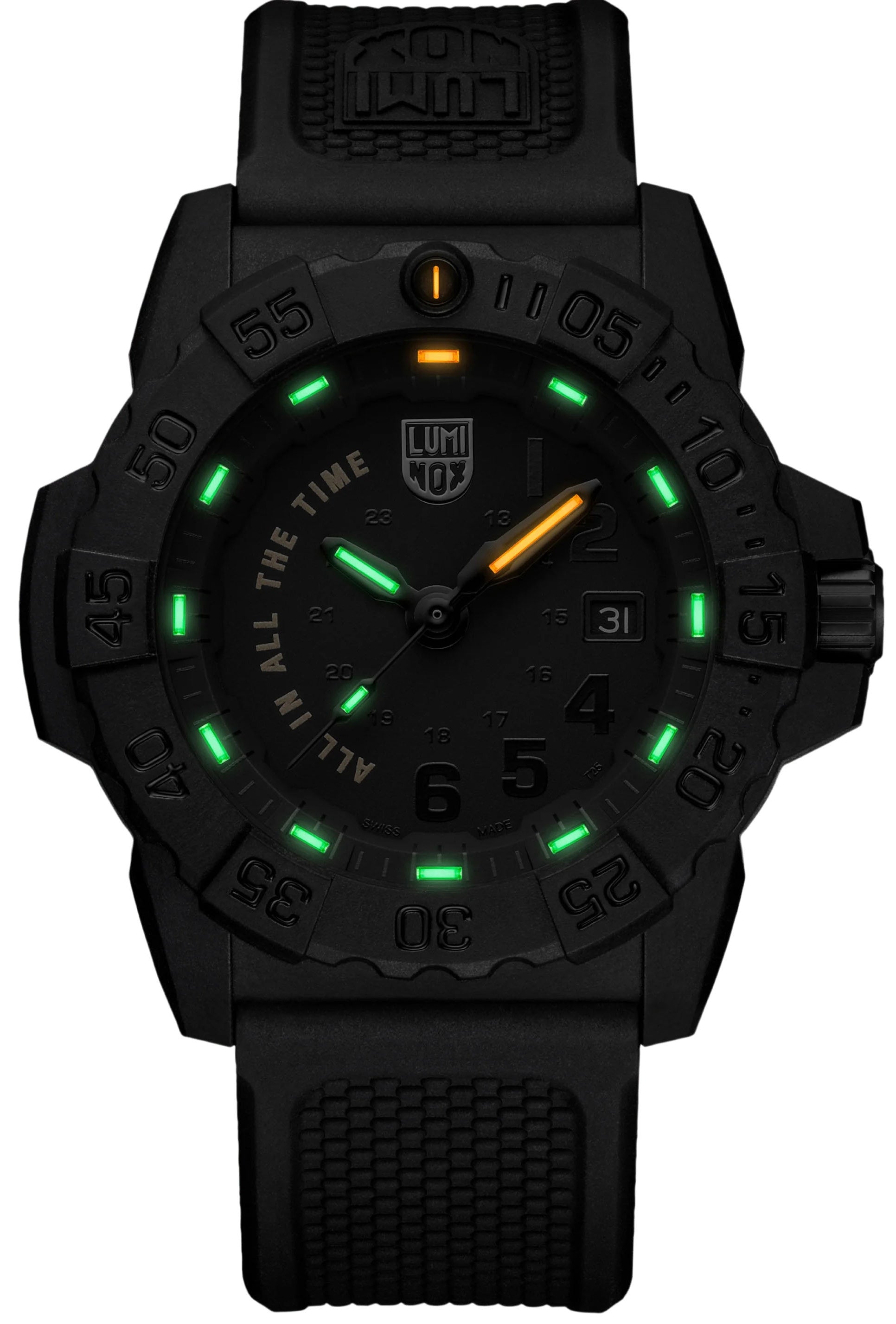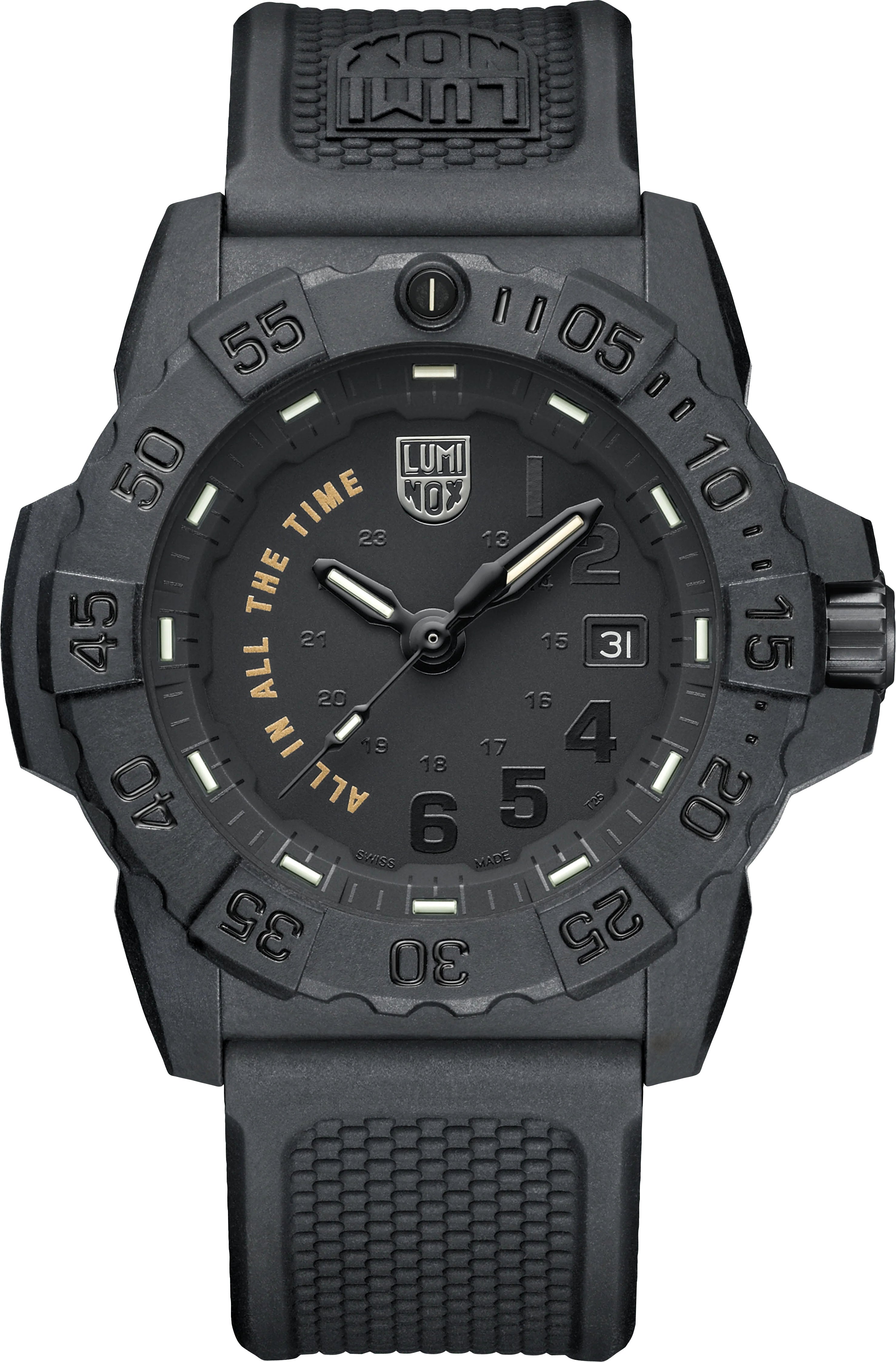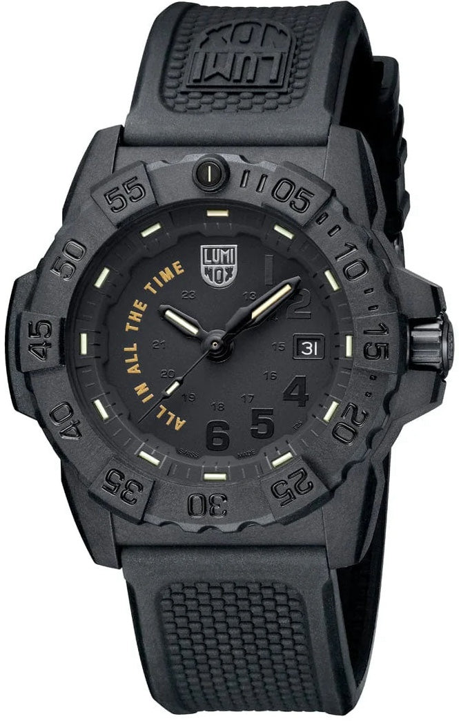 Luminox Watch Navy Seal All In All The Time Limited Edition XS.3501.BO.AL. This special limited-edition of the 3500 Navy SEAL series celebrates one of the SEALs key mantras, “All In All The Time. It is embossed in gold colour on the dial from 7-11 hours and together with the gold tone Navy SEAL trident logo on the case back creates a striking contrast to the black-out design. With a 45mm CARBONOX case and uni-directional bezel, the timepiece is made from carbon fibre, making it extremely lightweight and durable. The integrated Luminox Light Technology ensures that the watch glows 24/7 no matter the light condition. Limited to 775 pieces worldwide, this extraordinary timepiece inspires to be ‘ALL IN ALL THE TIME’.