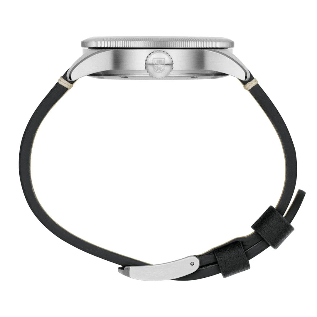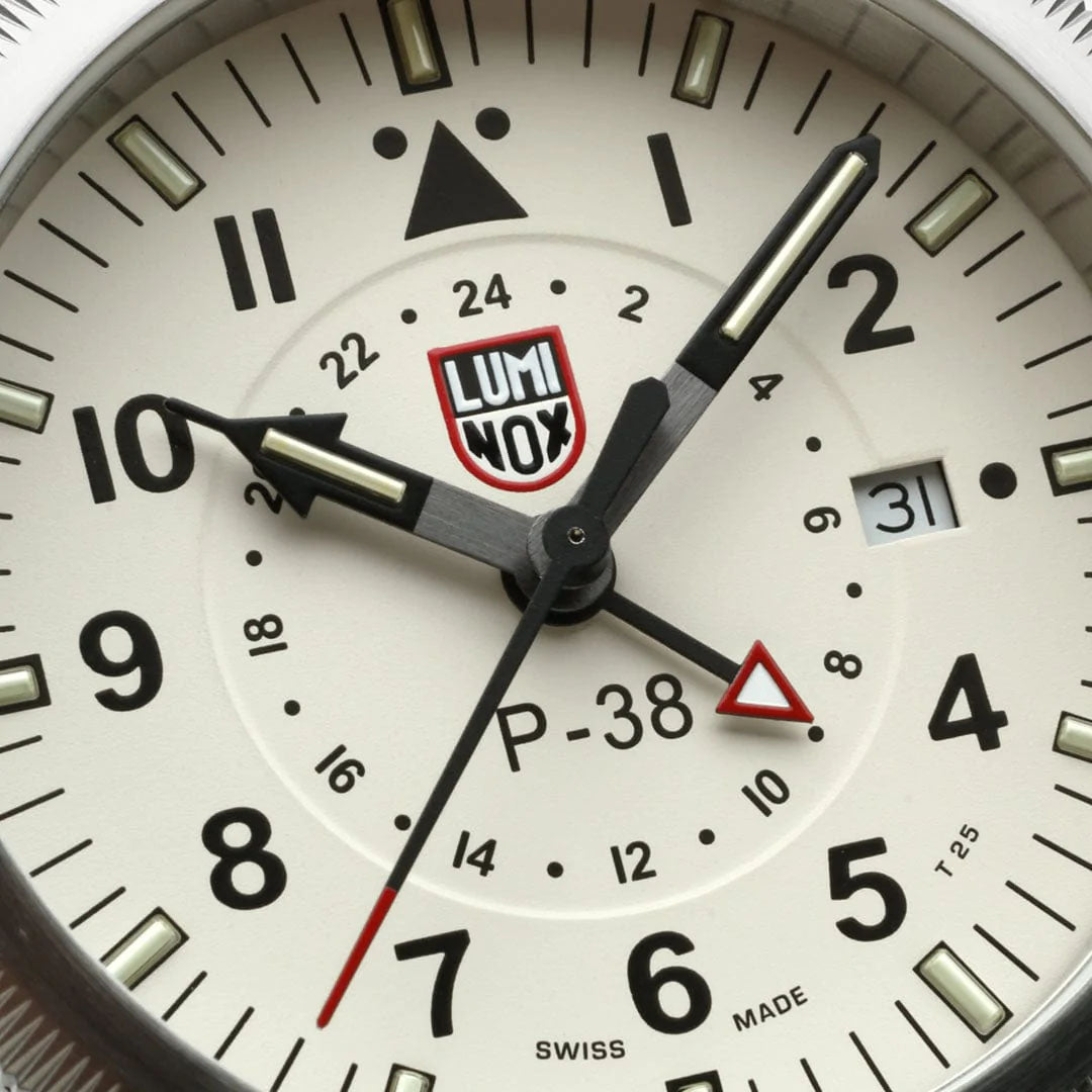 Luminox Watch Air Pilot P-38 Lightning 9520 Series XA.9527. The timeless P 38 LIGHTNING with a 42mm beige dial and sapphire crystal comes with a black leather strap with Luminox signature buckle. The second timezone makes it a must have for any worldwide traveler.