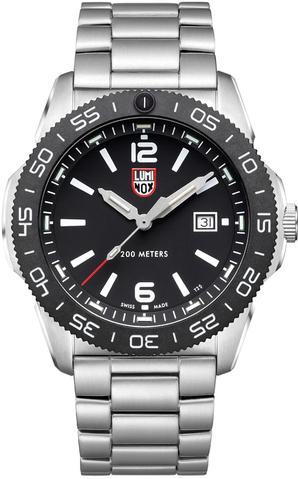 Luminox Watch Pacific Diver Mens XS.3122. The Pacific Diver series features a 44 mm stainless steel case with a CARBONOX uni directional bezel, resulting in an eye catching fusion of materials. Model 3122 comes as a black dial and black bezel on a stainless steel bracelet. The Pacific Diver series features water resistance to 200 meters, screw in crown and case back, sapphire crystal and, of course, the Luminox Light Technology, which guarantees constant night visibility for up to 25 years. The Luminox Pacific Diver 3120 Series is the perfect casual watch capable of going anywhere anytime. It fits in at home, at the office, in the gym, and for your next adventure.