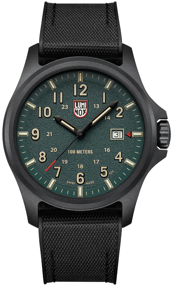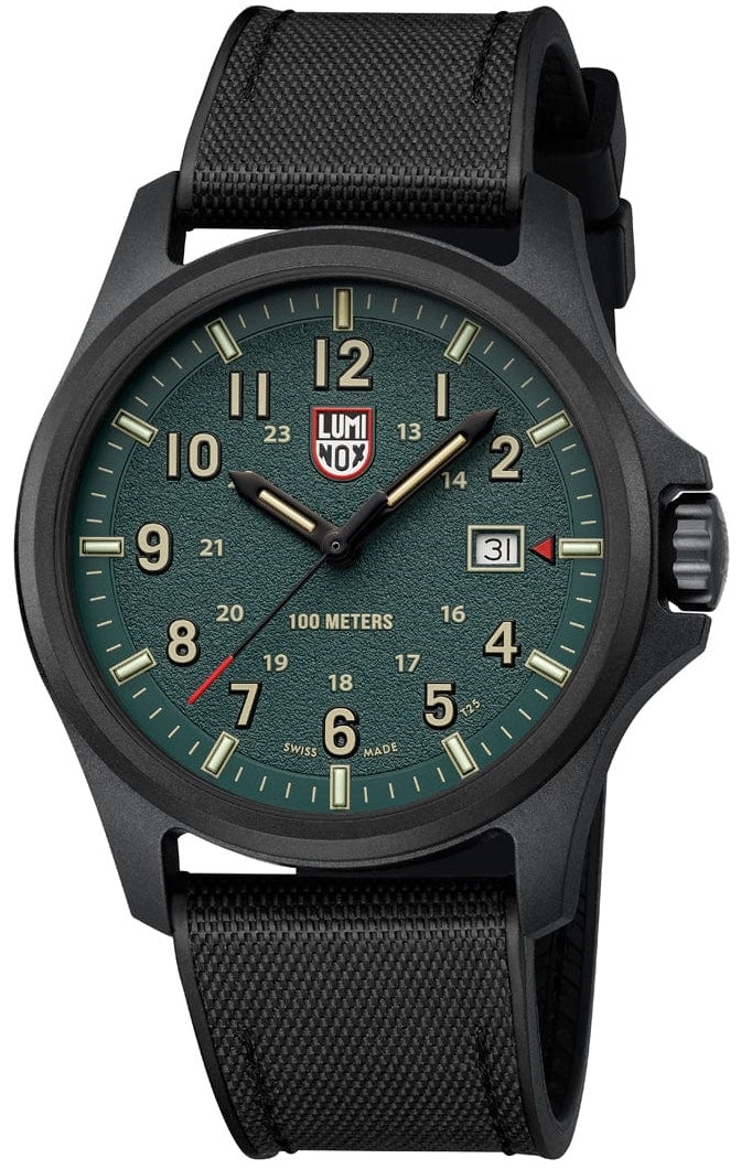 Luminox Watch Atacama Field 43mm Urban Adventure XL.1977. This Atacama Field 1977 watch is inspired by its namesake, the Atacama Desert. The design with a dark green dial with textured finish and sand hour numbers evokes the terrain and rugged landscape of the desert. The timepiece presents a large dial that displays the 12- & 24-hour clock, along with a red tipped second hand and red arrow next to the date at 3 o’clock for instant readability. The dial is protected by sapphire crystal with anti-reflective coating. The 43 mm CARBONOX case is matched with a black rubber strap.
