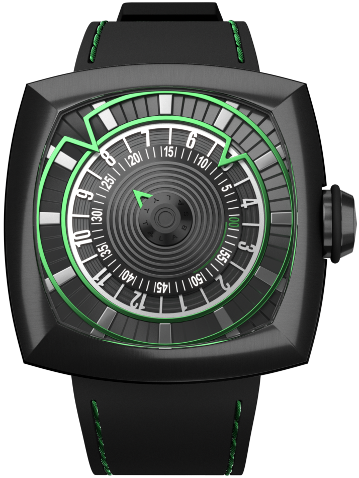 Lytt Labs Watch Green Gunmetal. Aluminum, high tech surface finishes. Powered by one of the most reliable automatic engines available. 2 Aluminum pointers anodized in Green display hours and minutes at fixed points, on 2 disks turning clockwise. Optimized in diameter, weight, and balance to ensure the time keeping performance.