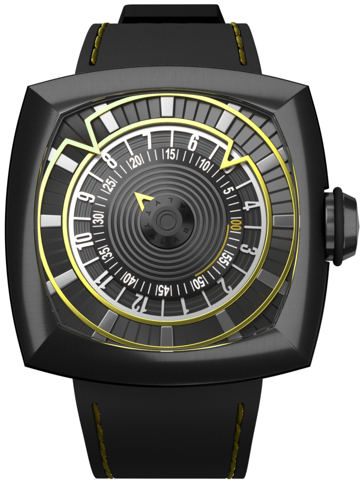 Lytt Labs Watch Yellow Gunmetal. Aluminum, high tech surface finishes. Powered by one of the most reliable automatic engines available. 2 Aluminum pointers anodized in Yellow display hours and minutes at fixed points, on 2 disks turning clockwise. Optimized in diameter, weight, and balance to ensure the time keeping performance.