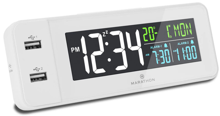 Marathon Clock LED Colour Display Dual USB Charging Alarm White CL030072-WH-00-NA. Marathon has been manufacturing timing instruments for the Allied Forces, and today the fourth generation of the family continues the tradition with a wide range of instruments measuring time, temperature and distance. Marathon watches combine military durability with Swiss engineering and craftsmanship to ensure the highest level of quality and precision. Marathon products are manufactured with the utmost care and go through various quality control measures. This attention to quality is supported by a commitment to excellent customer support to ensure the best possible product experience.