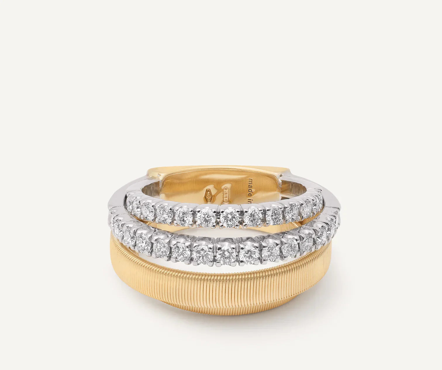 Two brilliant-cut diamond pavé bands meet two flat spiral threads, carefully created with the brand’s exclusive coil technique. A perfect interweaving for this elegant and sophisticated 18kt yellow gold ring, a real must-have with timeless appeal.