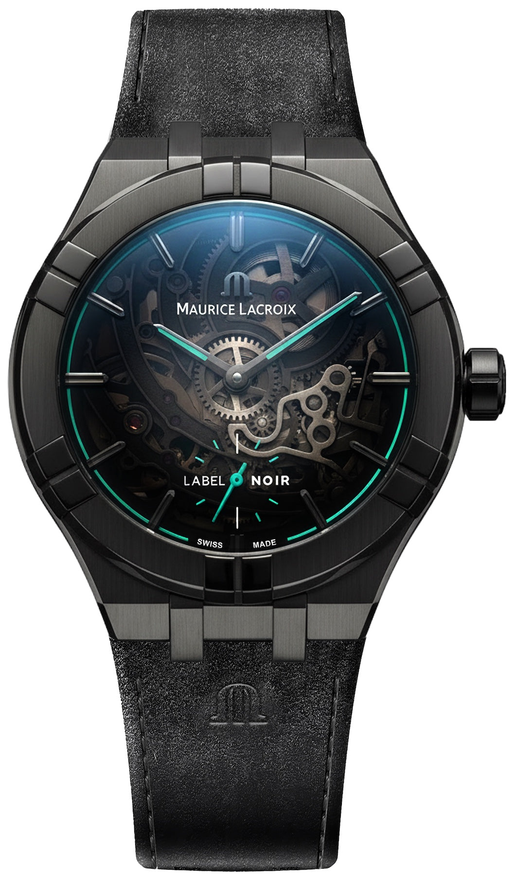 Maurice Lacroix Aikon Label Noir Manufacture Skeleton Limited Edition Watch AI6028-DLB0B-030-H. Responding to numerous customer requests, Maurice Lacroix has collaborated again with Label Noir, the Genevan based watchmaker. The two companies have previously worked together, creating co-branded watches in 2020 and 2024, both of which promptly sold out. Now, the Swiss companies have united to create a third limited edition model. Based on the AIKON Manufacture Skeleton but dressed in black with the addition of eye-popping turquoise accents, this model makes a powerful statement wherever it goes.