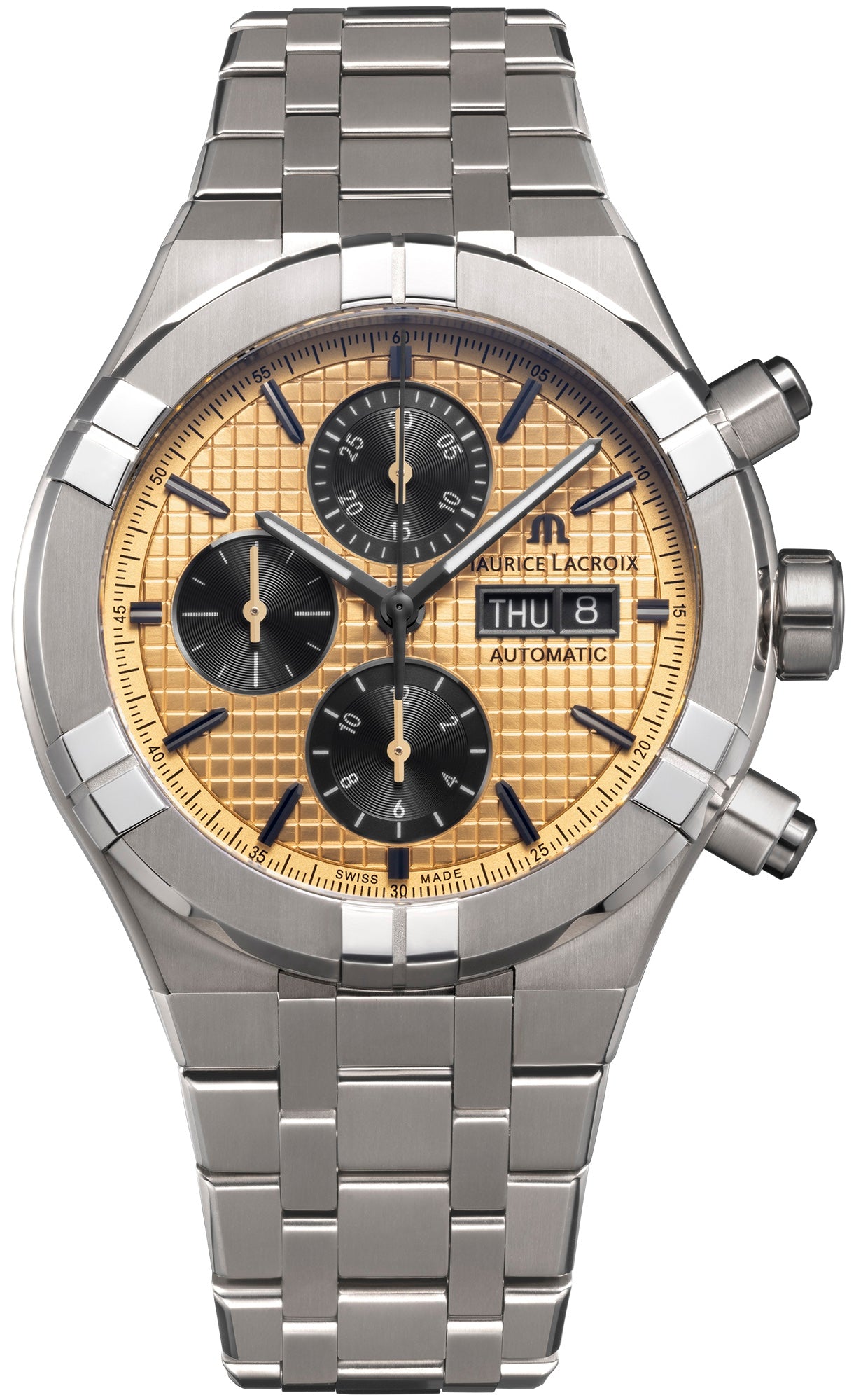 Maurice Lacroix Watch Aikon Titanium AI6038-TT032-530-1. Another benefit of AIKON ownership is versatility. Water-resistant to 200 m, both the AIKON Automatic and the AIKON Automatic Chronograph are compatible with an active lifestyle. In addition, these models are equipped with the ML Easy Strap Exchange system. This allows the wearer to adapt the look of their watch to their outfit, swapping the strap for an alternative with just a few user-friendly clicks.