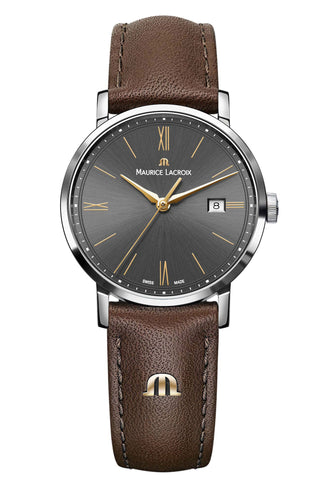 Maurice Lacroix Watch Eliros Date Ladies. Evoking a strong sense of femininity, the Maurice Lacroix Eliros Date Ladies is the perfect choice for an everyday companion. Culminating versatility enveloped within a unique blend of high grade materials, this quartz operated masterpiece is elegant, simple and classic. Maurice Lacroix watches chose to finish the Eliros Date Ladies in an authentic brown leather strap to complete a truly vintage look. With universal appeal, the timepiece can be worn as an office 9 to 5 or used to compliment matching silver and gold jewellery for after dark hours. The Maurice Lacroix Eliros Date Ladies showcases a 30mm beautifully smooth and silky light anthracite dial with gold coated central hour and minute hands that interact with matching traditional Roman numeral hour markers at 12, 3, 6 and 9. Enclosed within a perfectly round stainless steel bezel, the structure of the Maurice Lacroix Eliros Date Ladies protects the dial and internals from 30 meters of water resistance. As promised in its title, the timepiece displays a clear, crisp date window at 3 o clock for high legibility. Supplier model number EL1084-SS001-813-002