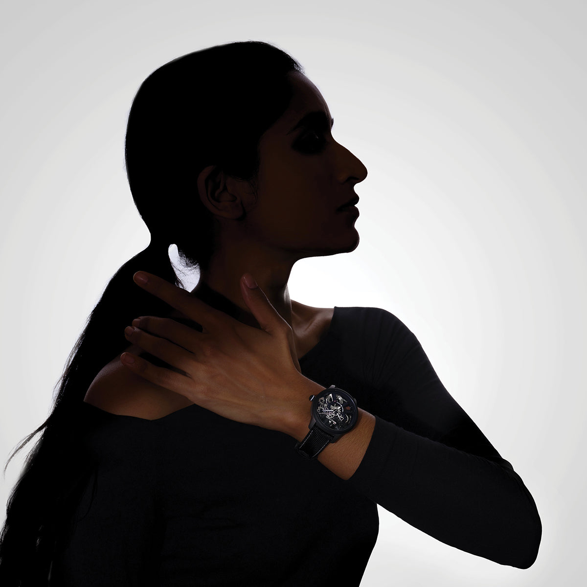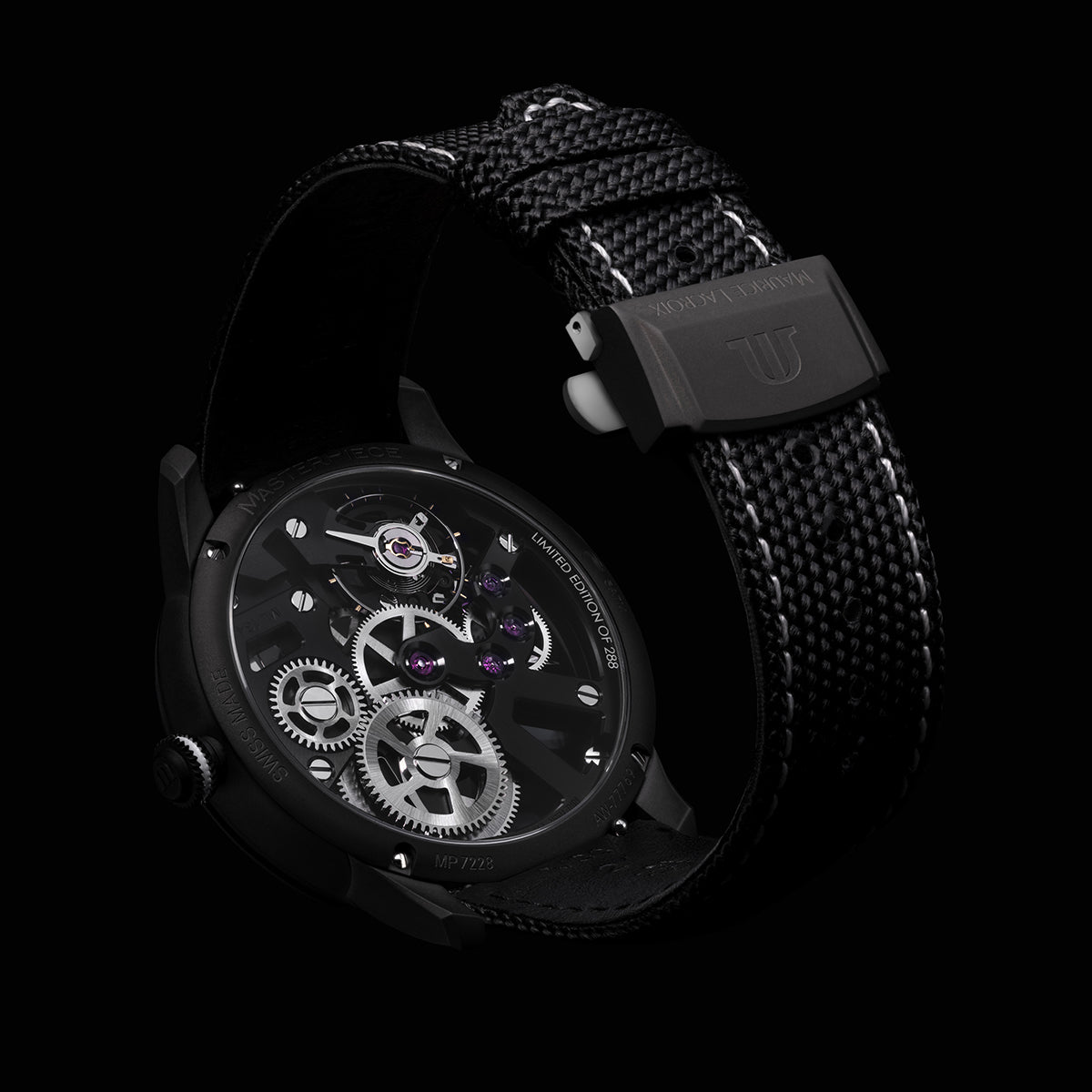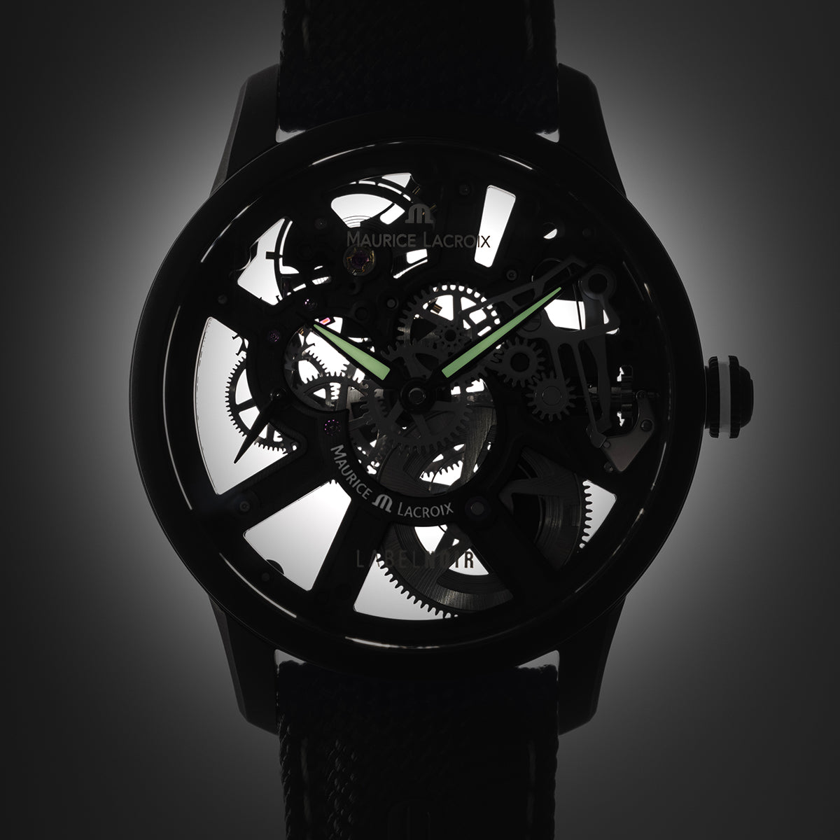 Maurice Lacroix Watch Masterpiece Skeleton Label Noir Limited Edition MP7228-DLB04-090-2. Created in partnership with Label Noir, Maurice Lacroix unveils a version of its MASTERPIECE Skeleton. Equipped with a highly refined in-house movement, this model reveals many components usually hidden from view. Label Noir has played with light and shade, disclosure and stealth, as well as black and white hues, skilfully juxtaposing contrasts. The resultant watch, the MASTERPIECE Skeleton Label Noir, limited to 288 pieces, showcases the creativity of both brands and the wisdom of being inventive.