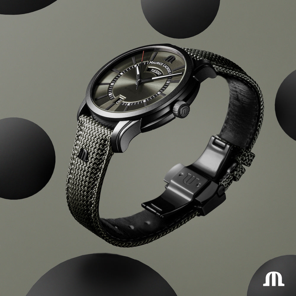 Maurice Lacroix Watch Pontos Day Date Khaki Limited Edition PT6358-DLB04-630-5. A colour palette of khaki and black may imply a desire to hide from attention, however , the PONTOS Day Date reverses this idea. With its interesting blend of contrasting shades, this new model stands out, especially within an urban landscape. It’s eminently chic and notably practical. The case is ergonomically optimised for the wrist and it’s suitable for both male and female wearers. Quite simply, there are many reasons to recommend this exemplar of urban chic.