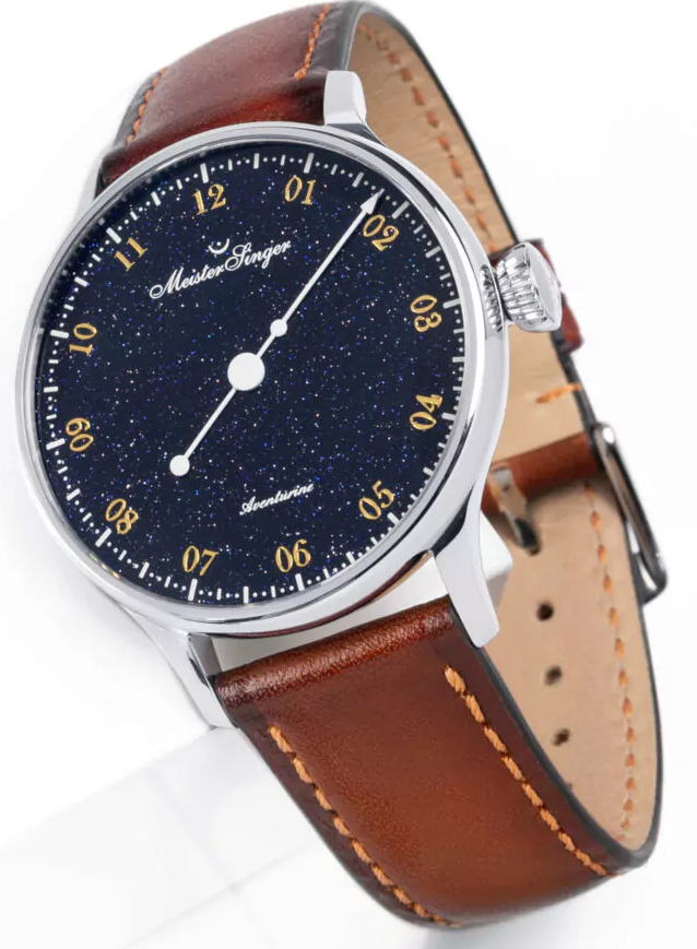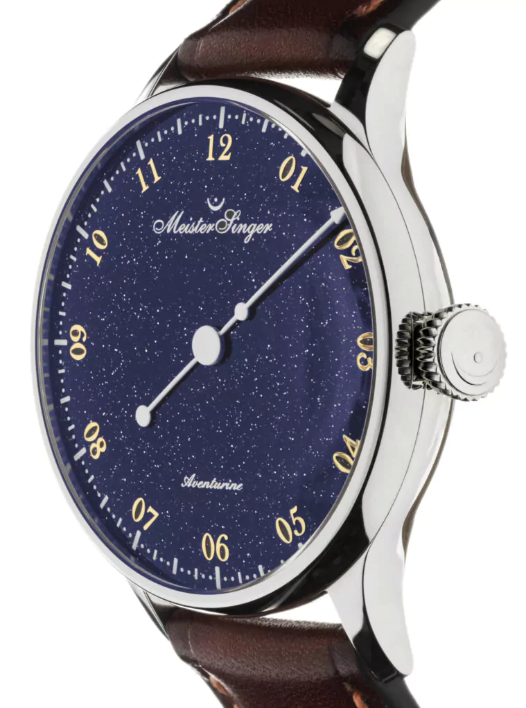 MeisterSinger Pangaea Aventurine Deep Blue Natural GlassWatch PMN9908AV. The deep blue aventurine captivates the eye with its characteristic shimmer, created by countless sparkling inclusions suspended in the material. These reflect the light and produce the so called aventurescence, a special brilliance with a lively sparkle that lends each dial its unique depth and radiance. The typography is reminiscent of historical dials, giving the watch a somewhat nostalgic character. The gold coloured, multi-printed numerals stand out vividly to create a sophisticated three dimensional effect. Instead of the usual 5 minute line markers, fine dots are used to signify the passage of time. The design is rounded off by the exquisitely crafted MeisterSinger hour hand, harking back to an era when watches were still worn on a chain.