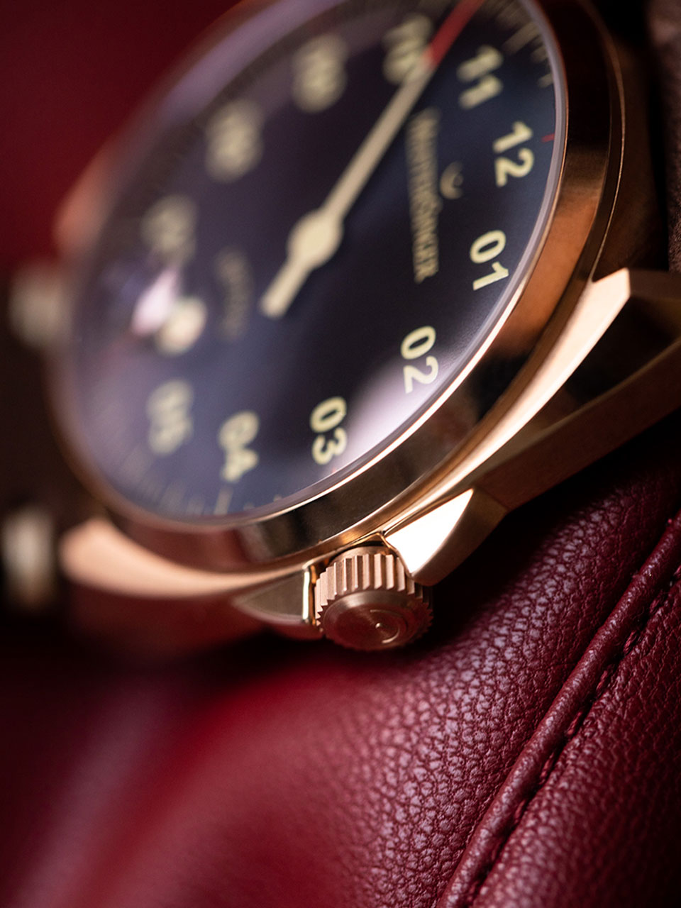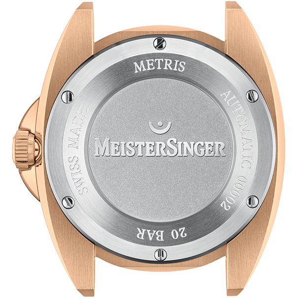 Meistersinger Watch Metris Bronze Line ME917BR. The Meistersinger watches Metris is a young, robust companion for any time and any place, for the office or the beach. The contrast between these signs of ageing and the sunburst blue dial are therefore all the more interesting. The multifaceted structure of the case and the opulent blue dial make the Metris an eye catcher in any situation, even if the gala calls instead of the wilderness. The bronze case of the Metris has a diameter of 38mms and a sixfold screwed stainless steel caseback. The watch is powered by a Swiss automatic movement. The Metris in bronze comes with a dark brown saddle leather watchstrap and a bronze buckle