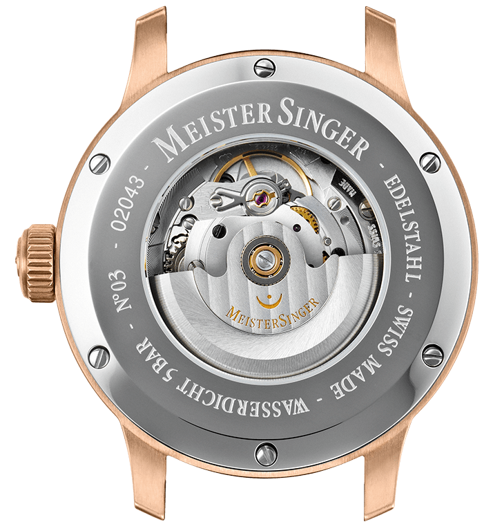 Meistersinger Watch N.03 Bronze Line AM917BR. No second hand, no minute hand, no date, no split second hand, no second and third time zones and no winding. The kinetic energy of your arm automatically winds the mainspring as you move. And automatically slows your perception of time.