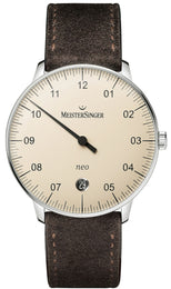 MeisterSinger Watch Neo NE903N. MeisterSinger watches manufactures single hand watches. The leanest and flattest of these is the Neo. It is one of those timepieces that appears ultimately familiar in its measurements and design, as if it had been around for decades. Its diameter of 36 millimeters, the thin bezel and the Hesalite glass make the Neo seem like it was created in the 1950s.