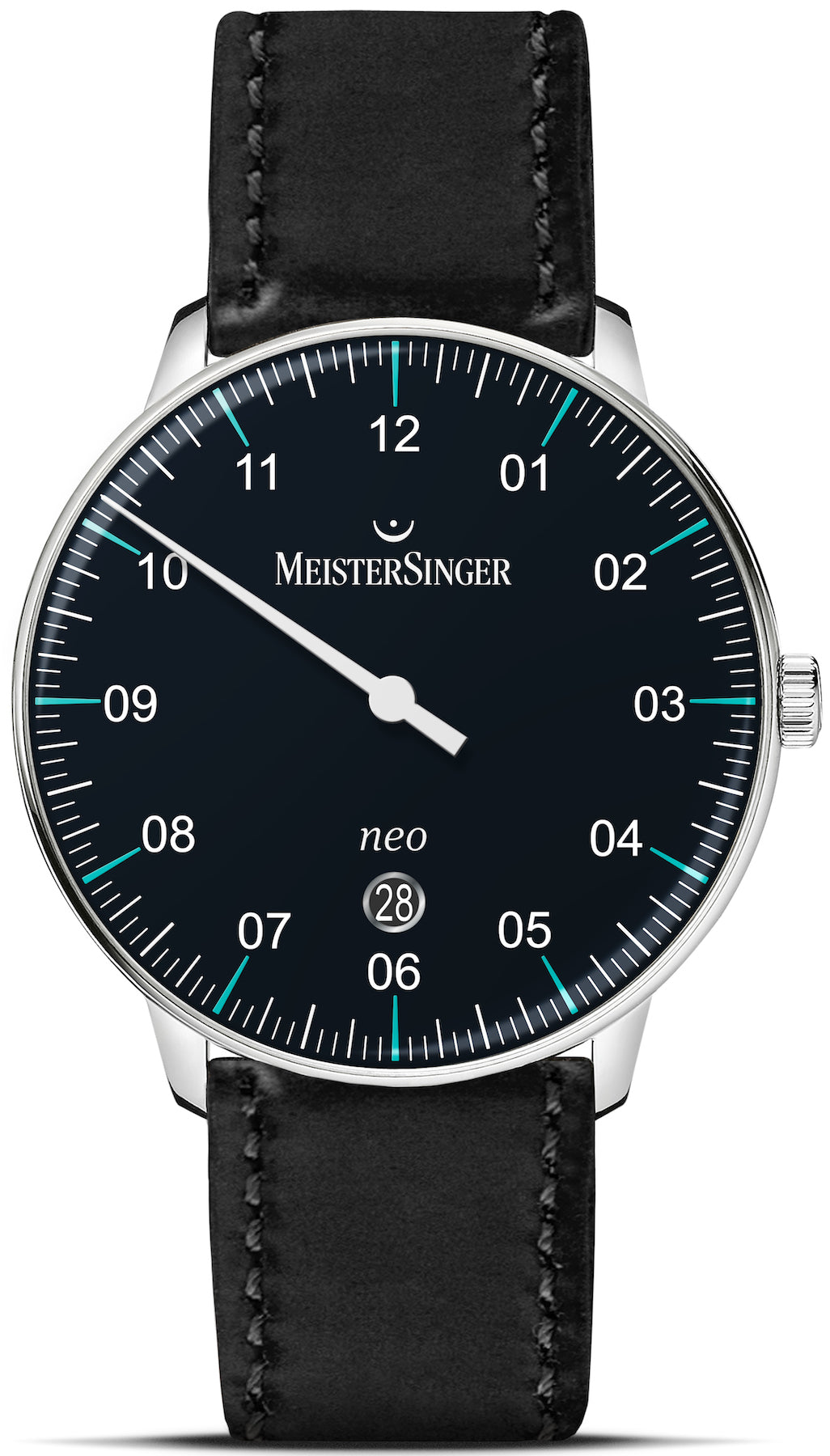 MeisterSinger Watch Neo Plus NE402T. The Neo has been a successful model in the MeisterSinger collection for years already. Its clear, balanced design gives it a 1960s look and feel. The two piece case construction, consisting of a middle section and the case back, was particularly typical of this period. In combination with the domed glass, which was popular at the time, the Neo is designed without a bezel, creating an engagingly beautiful look with its narrow case rim and huge dial. MeisterSinger is also taking up the vintage look of the Neo series in the dial colour: The friendly azure blue is reminiscent of the colour often used in American Diners.