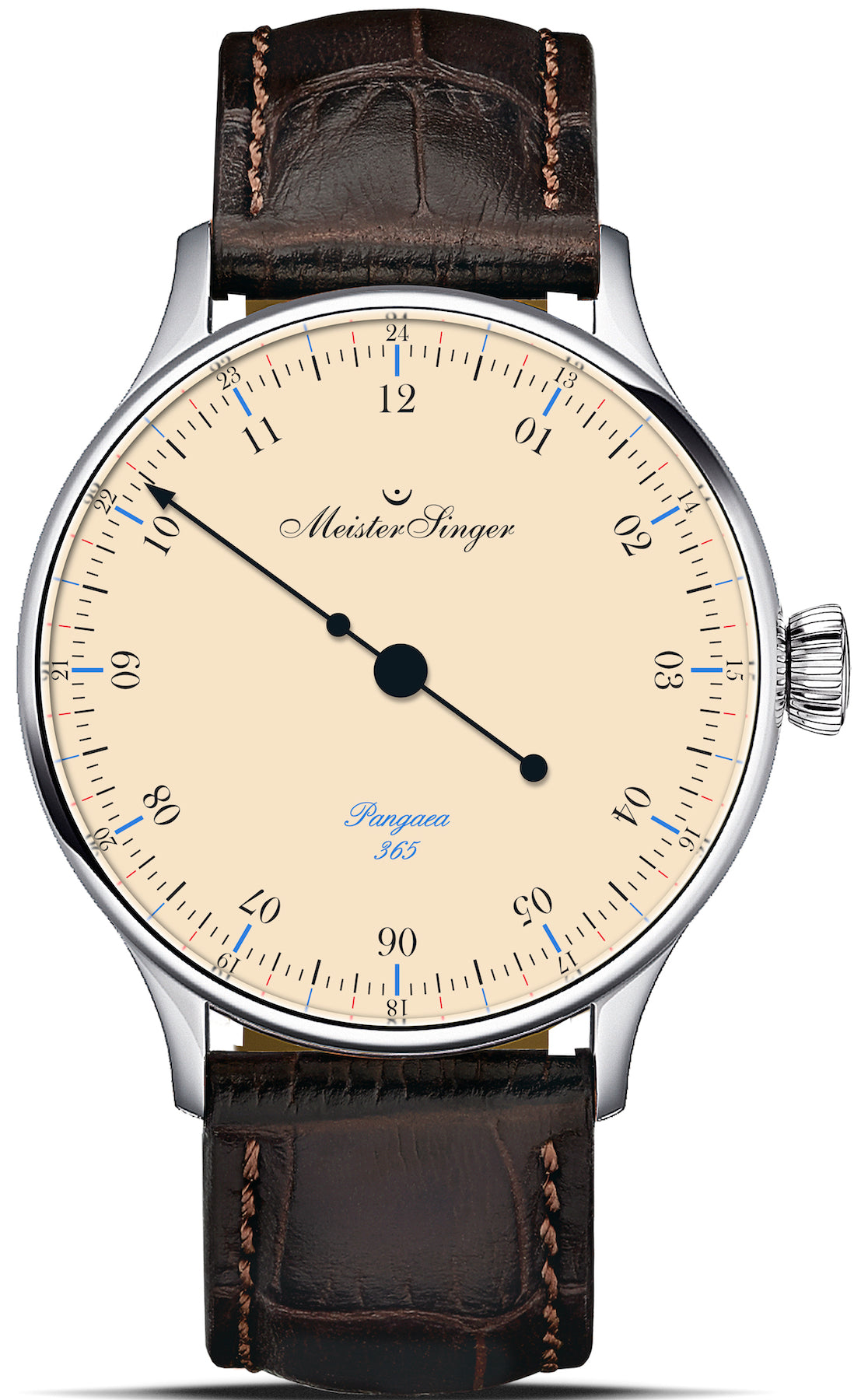 MeisterSinger Watch Pangaea 365 Limited Edition S-PM903. With its sleek, seemingly flowing case and a diameter of 40mm, the Pangaea is one of the most elegant timepieces in the MeisterSinger collection. The fine serif typeface, which also features in the logo and the name of the model, the specially designed needle-shaped hand with its extra-long overhang, and the delicately finished indices at the edge of the dial all contribute to the overall visual appeal of this watch. Moreover, the ivory- coloured dial, a typical MeisterSinger hallmark, is embellished with blue and red highlights. An imprint on the glass exhibition back emphasises the fact that this watch is one of only 200 pieces manufactured.