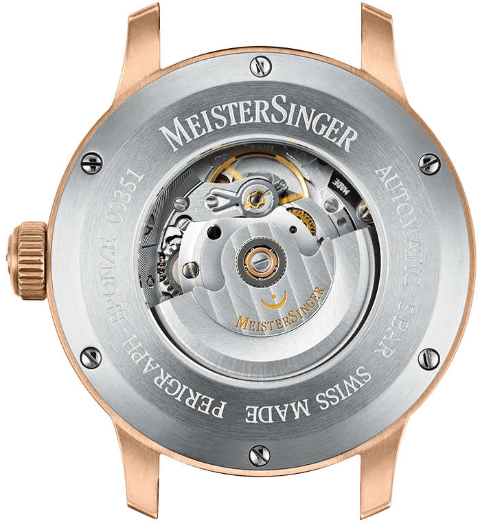 Meistersinger Watch Perigraph Bronze Line AM1017BR. The Meistersinger watches Perigraph follows the MeisterSinger principle of clear circular arrangement. The date is not displayed in a window, but on the open date disk at 12 o clock, making the Perigraph particularly reminiscent of classical analog instruments. This impression is additionally reinforced in the bronze version, thus creating the image of noble commitment to scientific traditions. The reverse side of the Perigraph features a sixfold screwed stainless steel back with an exhibition window that provides an excellent view of the Swiss automatic movement. The bronze watch with its dark brown, hand sewn saddle leather watchstrap and bronze buckle