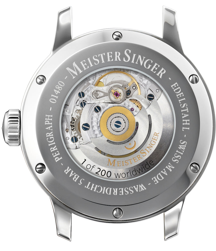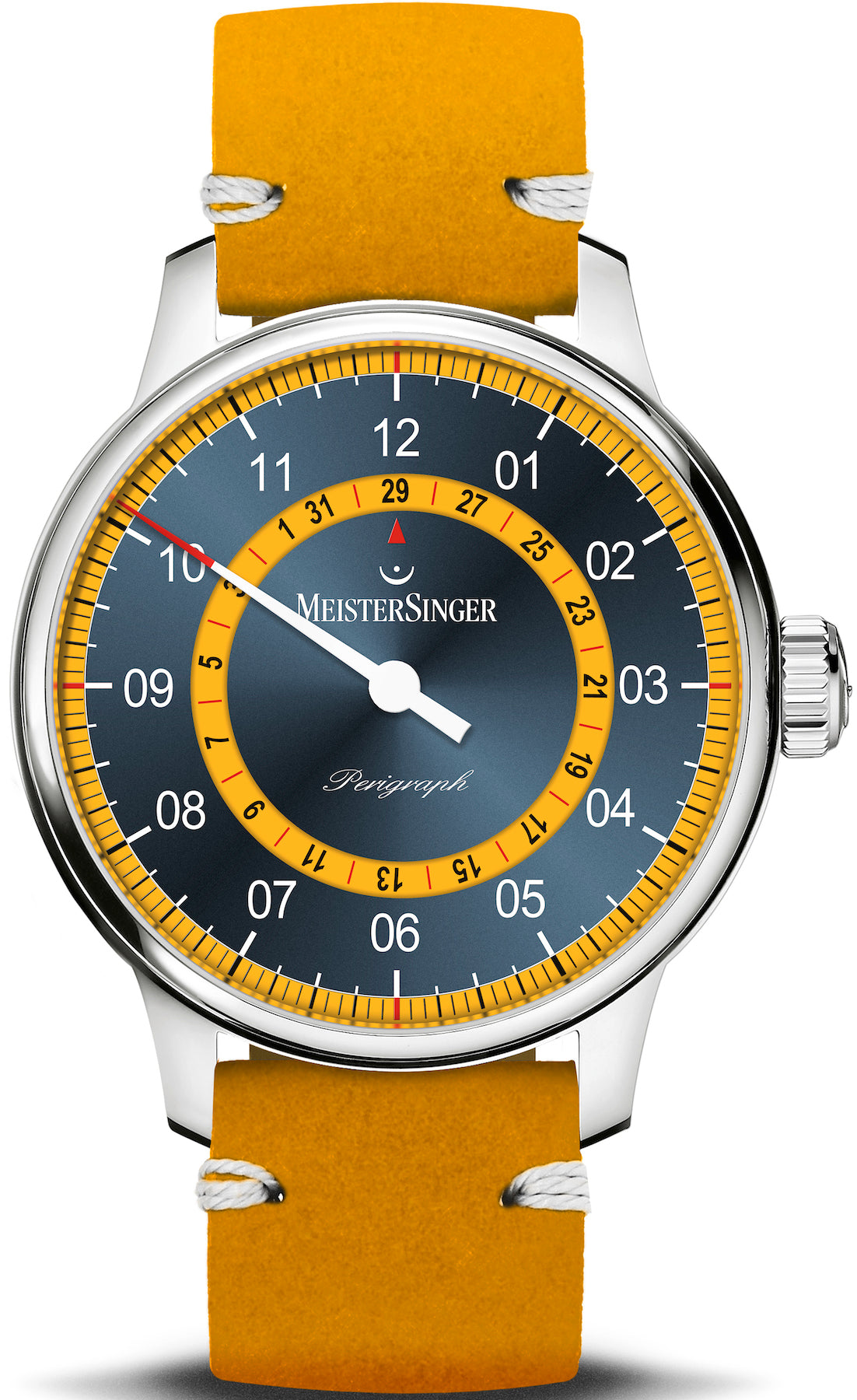 MeisterSinger Watch Perigraph Mellow Yellow Limited Edition S-AM1025. The MeisterSinger watches Perigraph is one of the classic models designed by the single hand watch specialist MeisterSinger and shows no signs of fatigue. All the variants designed in recent years have the open date disk in common, giving the dial a clear and convincing structure.