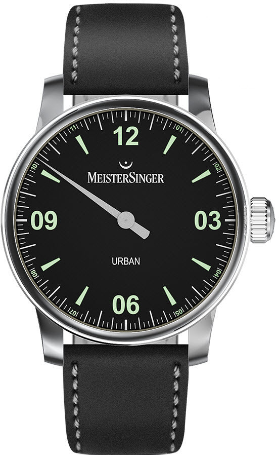 MeisterSinger Watch Urban UR902. The MeisterSinger watches Urban, features the typical hallmarks of a MeisterSinger watch, but in a variation that makes this new watch something unique and very special, as it features particularly large digits at 12, 03, 06, and 09 o clock in striking typography. The other hours are marked by small numbers and wedge shaped indices that perfectly match the powerful design of the single hand. The Urban has a distinctive look that ideally matches the effortless outfi t of the cosmopolitan global citizen, the streetscape of the modern city, and everyone who prefers simple elegance to complexity.