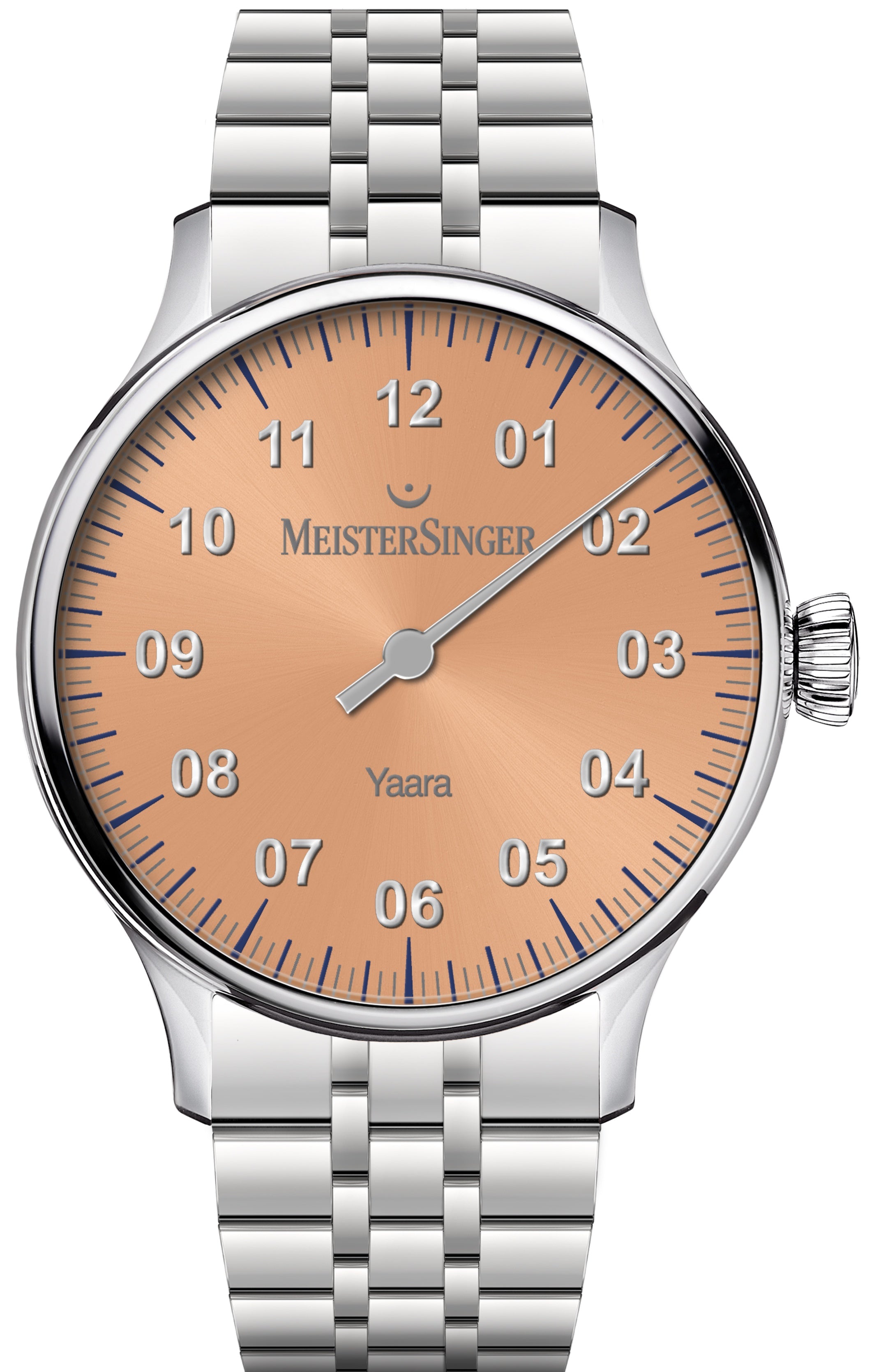 MeisterSinger Watch Yaara Salmon Silver YA916S. Anyone who has worn a single hand watch for two or three days knows it enables you to experience time in a different way. The rapidly passing seconds and minutes give way to a single hand that shows the time in the same way as the first mechanical clocks. A MeisterSinger single hand watch literally makes time pass more slowly, and encourages us to be self-determined and conscious with the most precious thing we have, our time.
