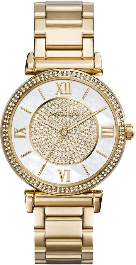 Michael Kors Watch Darci MK3332. Evoking a magnetizing elegant charm, this Michael Kors watch is dressed in a gold coated stainless steel shroud to not only protect the internal components inside this remarkable time keeping tool, but to represent an undeniable sophistication. Housed within a contemporary design, this unique wristwatch from the Michael Kors Darci collection fuses an number of exquisite elements together to produce a breathtaking vision of glamour and pristine beauty. A diamond drenched centre piece mounted onto a subtle, velvety golden finished dial, evokes a lavish appeal, encased within 38mm of gold coated stainless steel protection. The outer ring of the dial has been decorated in a mother of pearl finish allowing for oversized golden Roman numerals to indicate the hour markers at the 12, 3, 6 and 9 o clock with clarity. The Michael Kors lettering almost melts away into the diamond encrusted centre circle yet strongly reinforces the authenticity of the watch simultaneously. The Michael Kors Darci watch is water resistant to 100 meters and its strength and reliability are reinforced by a scratch resistant and anti reflective sapphire crystal glass. The Michael Kors watch is perfectly executed on a beautiful gold coated stainless steel bracelet for maximum impact.