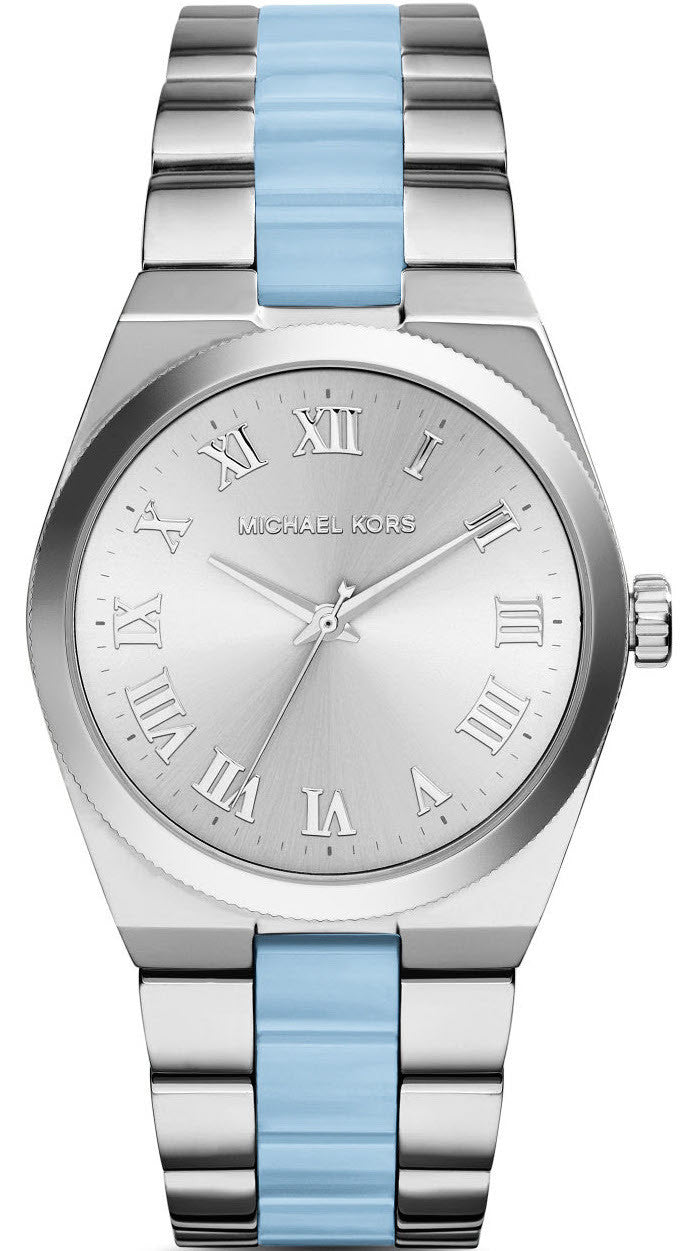Michael Kors Watch Channing MK6150. This stunning piece from the Channing collection adopts a truly simplistic approach to time keeping. Incorporating all of the brands fundamental design traditions, as well as a number of colour and texture combinations, this Michael Kors watch epitomizes contemporary elegance. Encased within a solid stainless steel shroud, the dial has been embellished with a sleek and polished silver finish with polished stainless steel Roman numerals that grace the periphery of the dial and a set of delicately sculpted hour and minute indices. The 38mm gentlemans watch is protected from 100 meters of water resistance thanks to its strong sapphire crystal glass front which has also been treated with anti reflective and scratch resistant qualities. The strong brushed stainless steel lugs lead to a two toned bracelet dressed in a powder blue for a pure and simplistic visual appeal. The Michael Kors Channing watch blends perfection with practicality and is an ideal 9 to 5 companion.