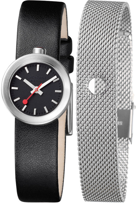 Mondaine Watch Aura Black. Petite, yet perfectly formed, the Aura watch offers all we love about Mondaine, but in miniature size. With the crown uniquely gracing the top of the case, the Aura is also distinctive for its easily interchangeable straps. You can gain a whole new look by changing the strap from leather to metal in a flash.