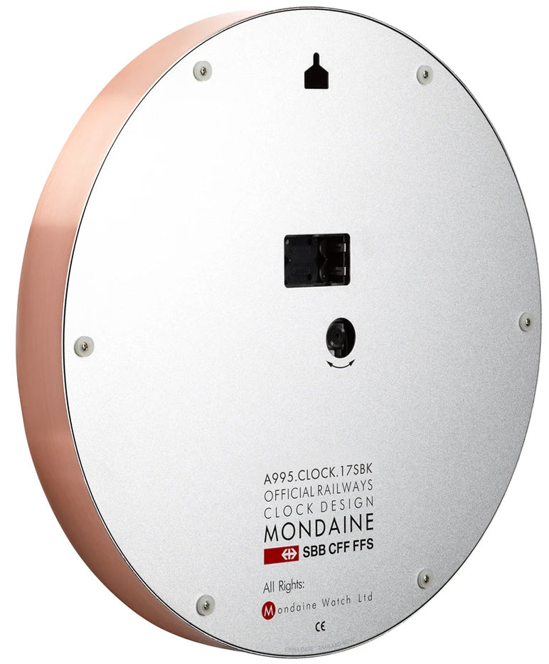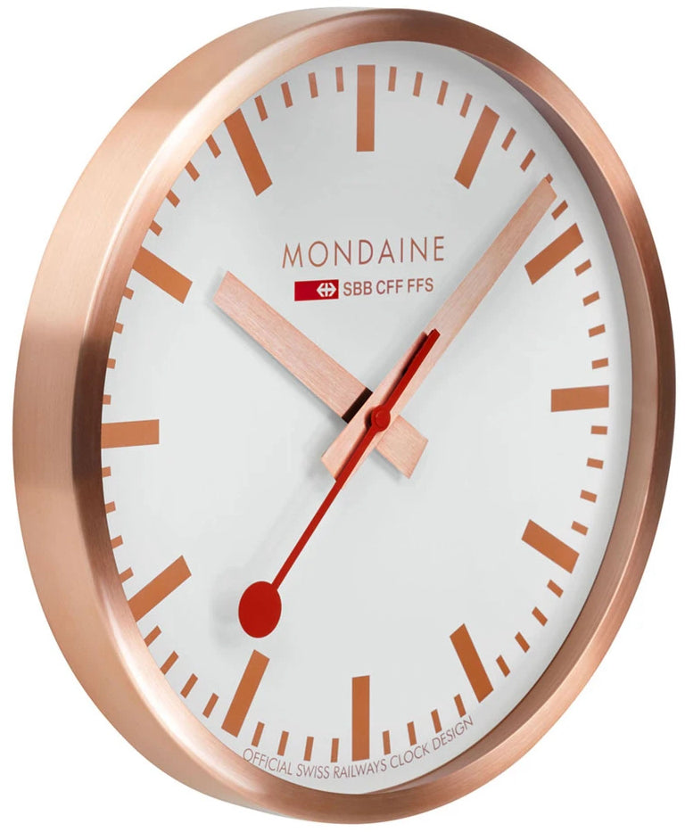 Mondaine Clock Wall Kitchen Copper A995.CLOCK.17SBK. For more than 100 years the Swiss Federal Railways have been famous for punctuality and precision. Historically the train station manager used a special red Paddle to announce to passengers and train conductors that the train is about to depart. This red Paddle with its special shape is also the second hand of the Official Swiss Railways Clock. Mondaines original and authentic watch and clock collection captures this pristine and punctual look.