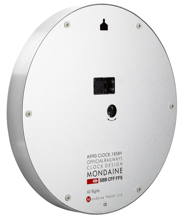 Mondaine Clock Wall Kitchen Silver A990.CLOCK.18SBV. For more than 100 years the Swiss Federal Railways have been famous for punctuality and precision. Historically the train station manager used a special red Paddle to announce to passengers and train conductors that the train is about to depart. This red Paddle with its special shape is also the second hand of the Official Swiss Railways Clock. Mondaines original and authentic watch and clock collection captures this pristine and punctual look.