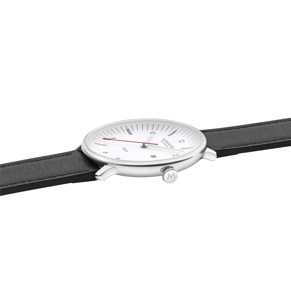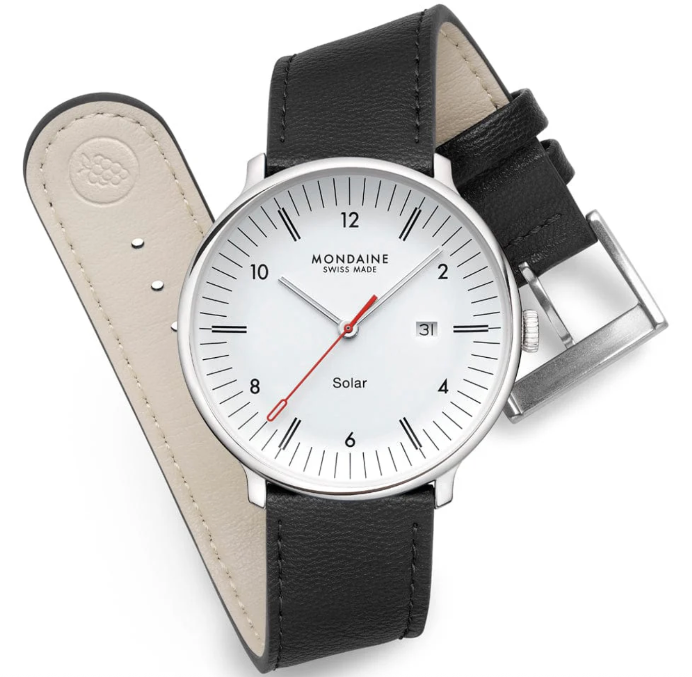 Mondaine Doppio 41mm Solar Watch MLE.41910.LBV. Mondaine Doppio, one that seamlessly blends heritage with innovation while staying true to our DNA of Swiss precision, minimalism, and sustainability. The name Doppio, is a tribute to the duality that defines this collection, balancing past and present, tradition and modernity, simplicity and sophistication. Inspired by the vision of André and Ronnie Bernheim, the collection symbolizes their dynamic collaboration and MONDAINE’s continued pursuit of innovation. This philosophy is reflected in every detail: featuring double lines that define the hour and minute hands, seamlessly extending this design concept to the dial indexes. The concave dial across the collection is a striking design element that creates depth and elegance. The result is a timepiece that feels both vintage and contemporary, bold yet understated,an elegant evolution of MONDAINE’s design language.