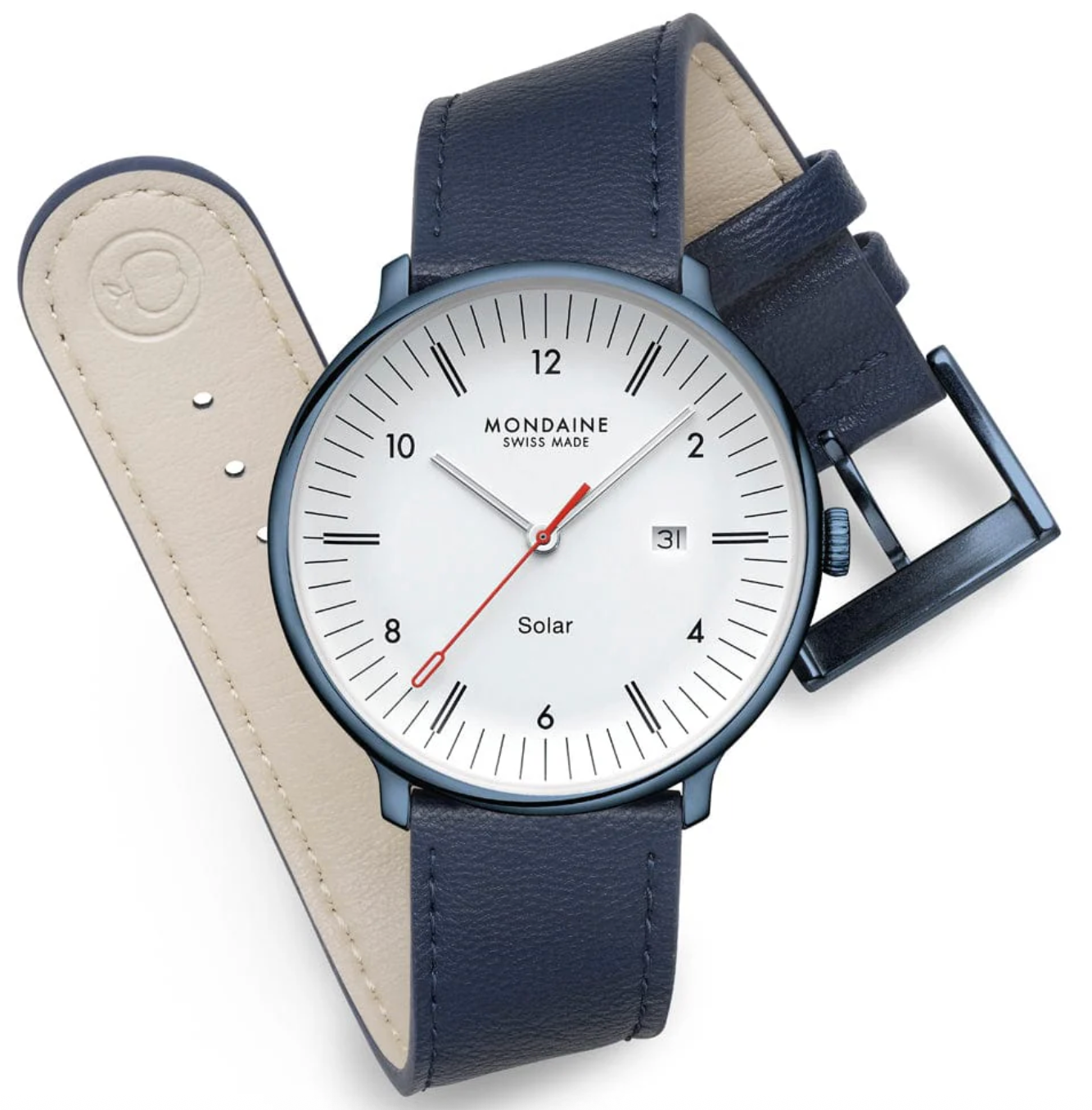 Mondaine Doppio 41mm Solar Watch MLE.41910.LQV. Mondaine Doppio, one that seamlessly blends heritage with innovation while staying true to our DNA of Swiss precision, minimalism, and sustainability. The name Doppio, is a tribute to the duality that defines this collection, balancing past and present, tradition and modernity, simplicity and sophistication. Inspired by the vision of André and Ronnie Bernheim, the collection symbolizes their dynamic collaboration and MONDAINE’s continued pursuit of innovation. This philosophy is reflected in every detail: featuring double lines that define the hour and minute hands, seamlessly extending this design concept to the dial indexes. The concave dial across the collection is a striking design element that creates depth and elegance. The result is a timepiece that feels both vintage and contemporary, bold yet understated, an elegant evolution of MONDAINE’s design language.