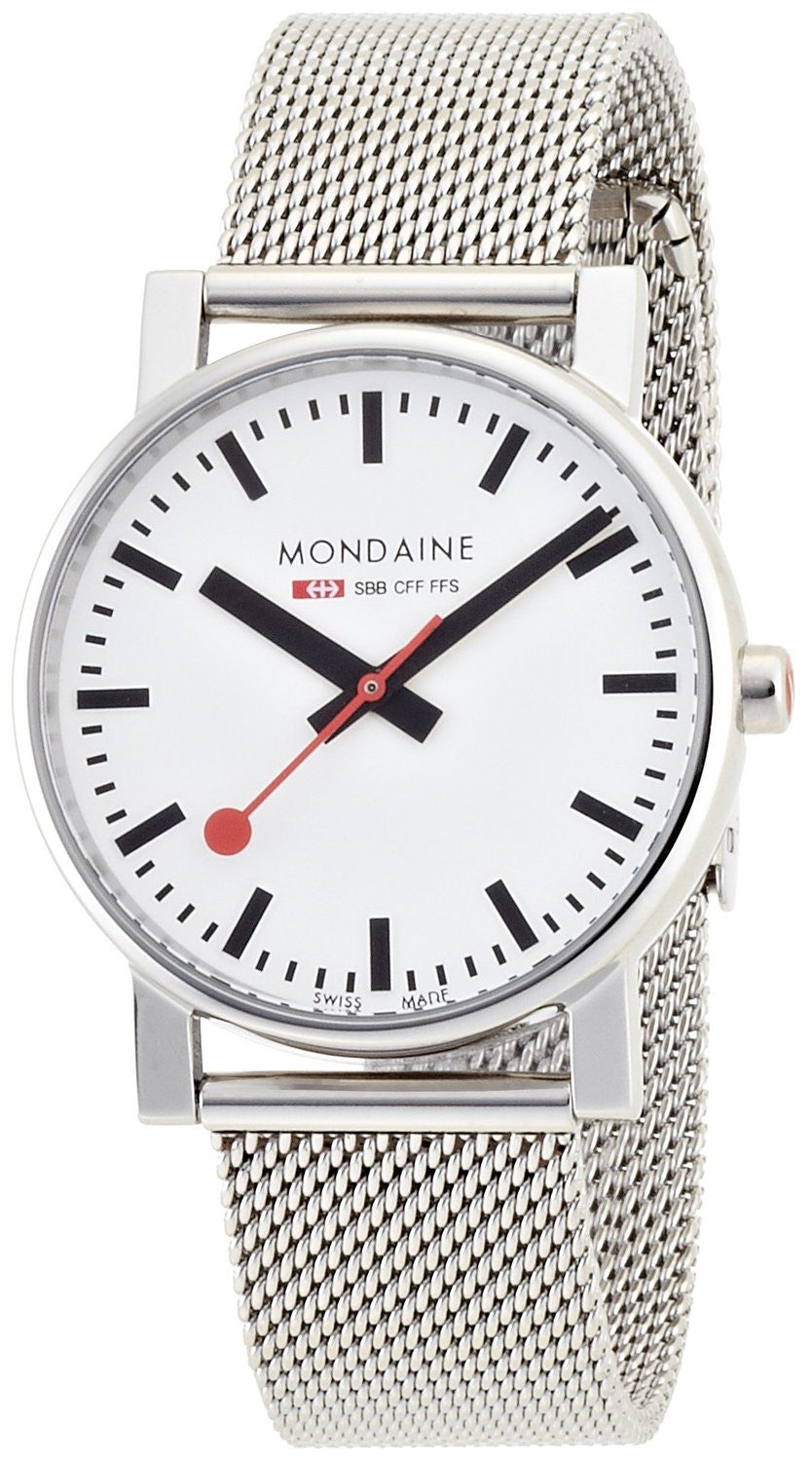 Mondaine Watch Evo A658.30300.11SBV. For more than 100 years the Swiss Federal Railways have been famous for punctuality and precision. Historically the train station manager used a special red Paddle to announce to passengers and train conductors that the train is about to depart. This red Paddle with its special shape is also the second hand of the Official Swiss Railways Clock. Mondaine's original and authentic watch and clock collection captures this pristine and punctual look.