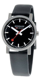 Mondaine Watch Evo. For more than 100 years the Swiss Federal Railways have been famous for punctuality and precision. Historically the train station manager used a special red Paddle to announce to passengers and train conductors that the train is about to depart. This red Paddle with its special shape is also the second hand of the Official Swiss Railways Clock. Mondaine's original and authentic watch and clock collection captures this pristine and punctual look.