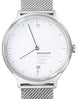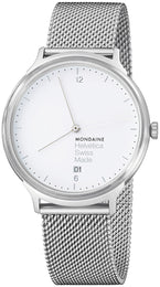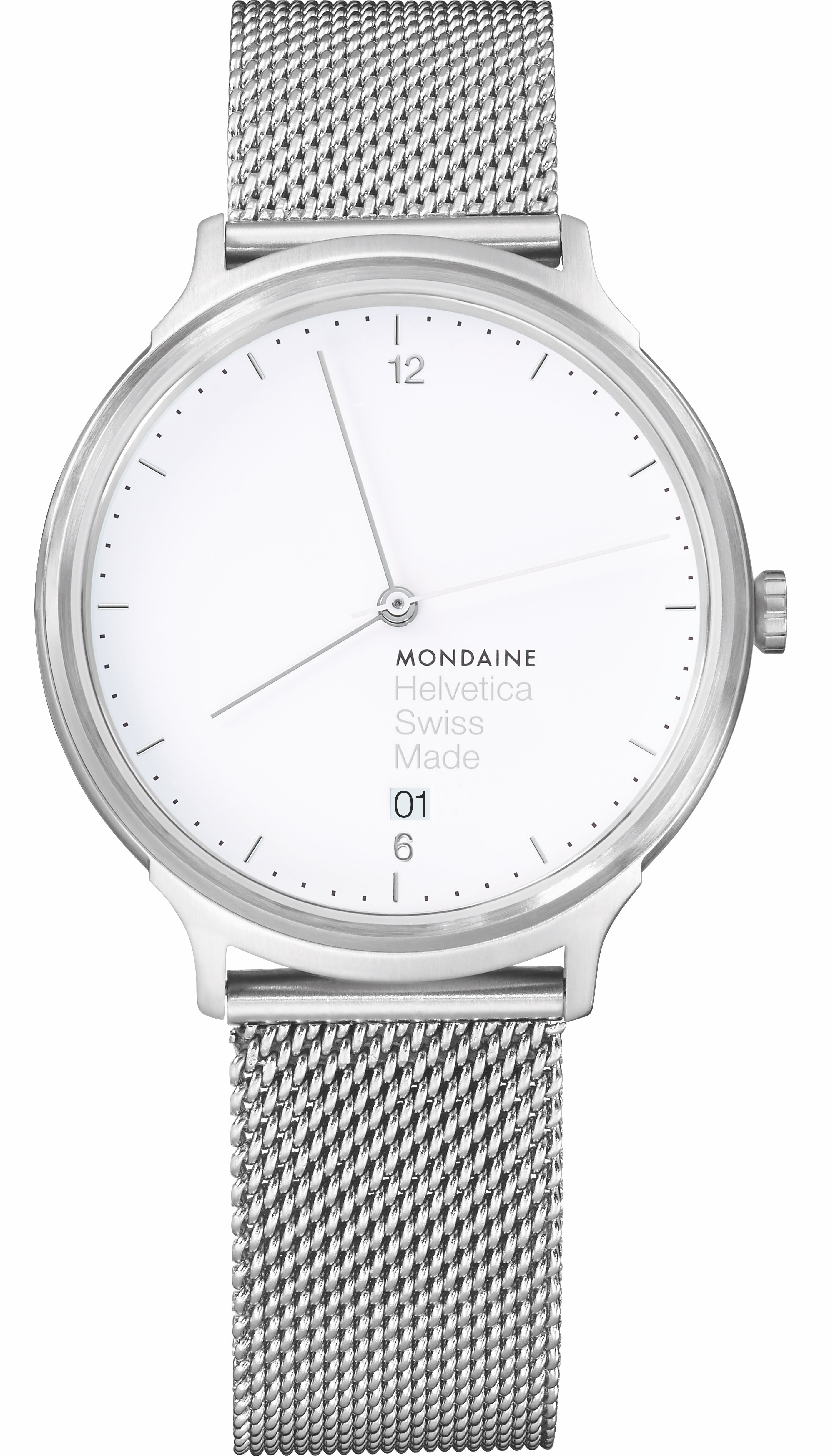Mondaine Watch Helvetica No1 Light 38. Transferring the essence of Helvetica to a watch. The result is a stringent design, with just a few design touches to surprise the eye. The Mondaine Helvetica watches date aperture, for instance, was moved off its traditionally central axis position to fit in with the typography on the dial. Acknowledging both, the font and the first in the collection of this new family member, the Helvetica number 1, with its famous curved crossbar, was cleverly used as a model for the lugs.