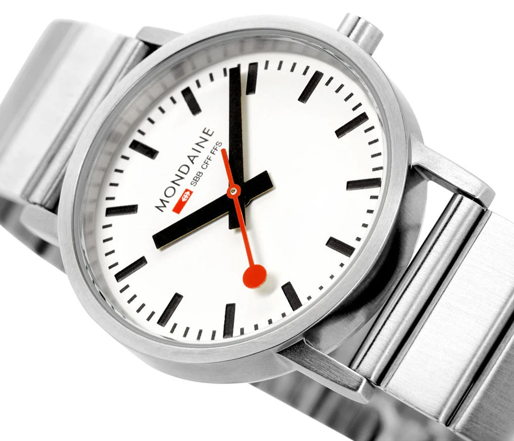 Mondaine Watch Classic Bracelet A660.30360.16SBJ. For more than 100 years the Swiss Federal Railways have been famous for punctuality and precision. Historically the train station manager used a special red Paddle to announce to passengers and train conductors that the train is about to depart. This red Paddle with its special shape is also the second hand of the Official Swiss Railways Clock. Mondaines original and authentic watch and clock collection captures this pristine and punctual look.