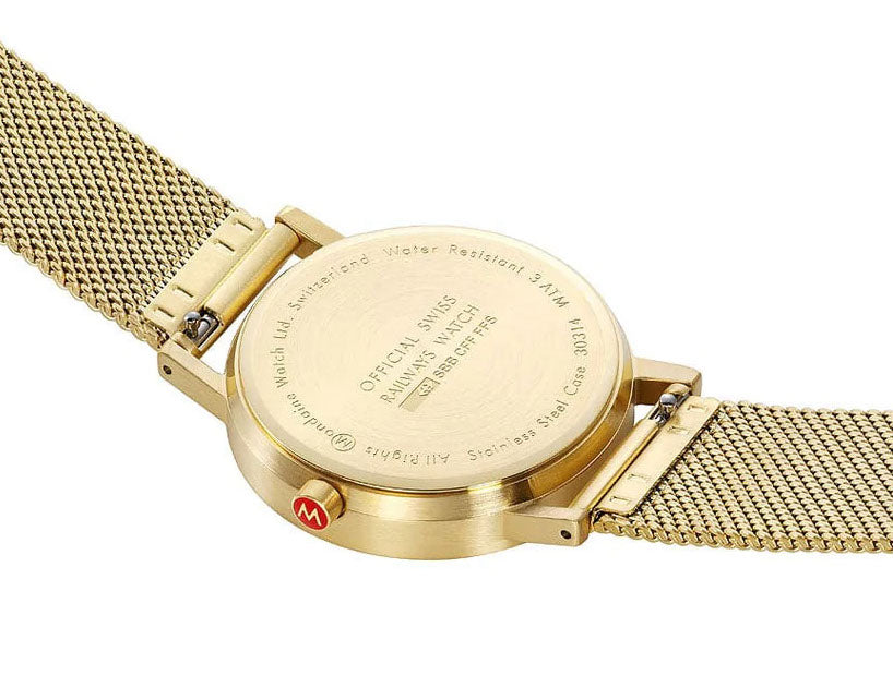 Mondaine Watch Classic Deep Ocean Blue A660.30314.40SBM. Inspired by nature This Classic collection watch showcases a 36mm tone-on-tone stainless steel IP gold plating, hands and markers with a polished finish to maintain the timeless design and minimalistic look of Mondaine. Featuring a Deep Ocean Blue dial and a stainless steel Milanese mesh band, this timepiece pays tribute to the wonders of our seas. Our Classic Collection comes with a clever quick-change system, allowing you to easily change your straps.