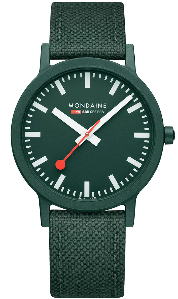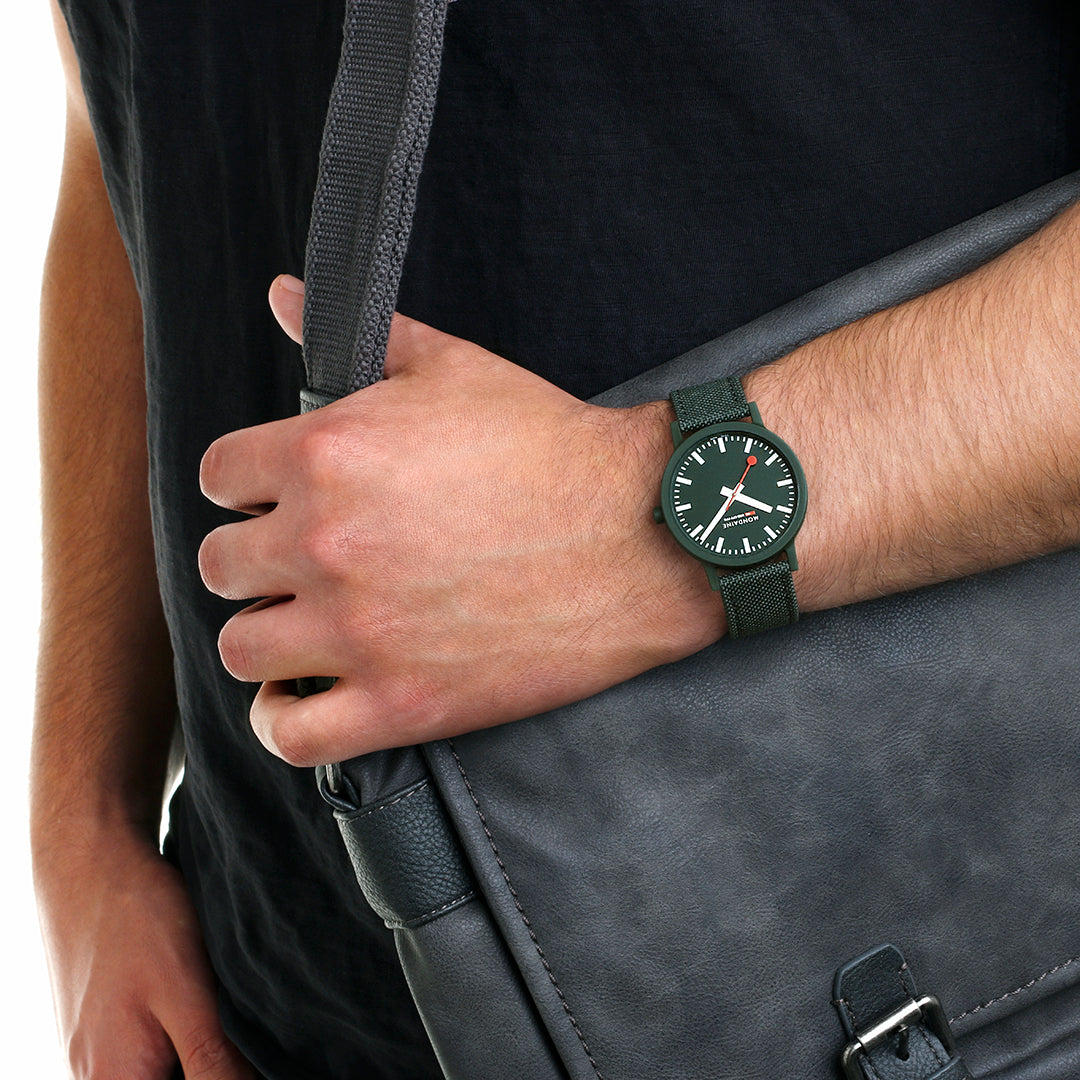 Mondaine Watch Essence Park Green Textile MS1.41160.LF. Mondaines essence watch collection combines innovation and sustainability. essence watches reinterpret the iconic design of the Mondaine Swiss Railways watch, using renewable raw materials such as castor oil, wool and cork. Browse the essence eco friendly watch collection in a range of colours, patterns, and strap materials.