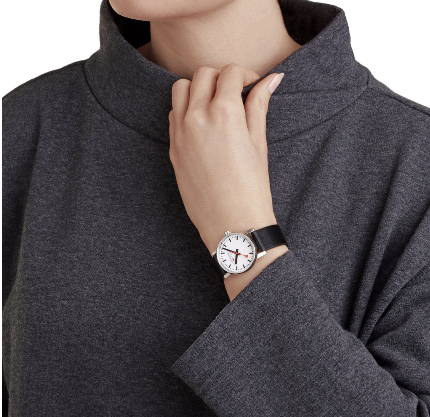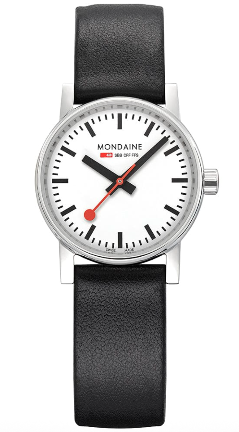 Mondaine Watch evo2 30 . The Mondaine SBB evo2 has been subtly refined for contemporary life. Its slightly rounded shape with an almost seamless transition to its case back has been ergonomically designed for ultimate comfort. Refined case lugs and a new functional crown sit in perfect proportion throughout the whole collection for precise balance.